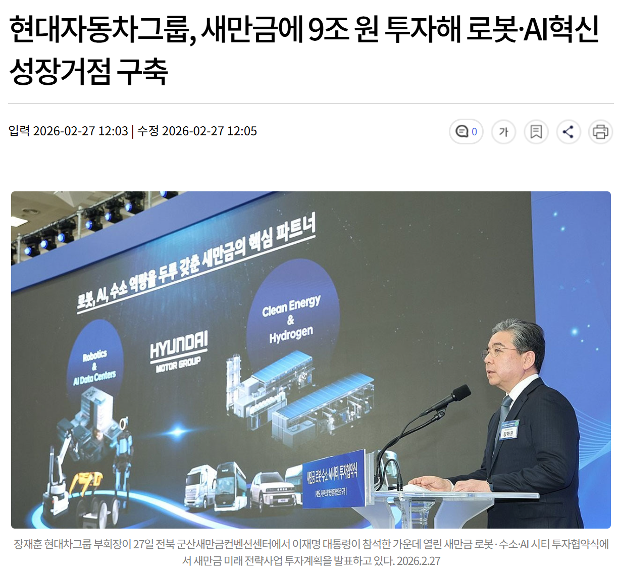 4740 경제현대자동차그룹, 새만금에 9조 원 투자해 로봇·AI혁신성장거점 구축 1 + 활활태워라 26/02/27 200 0