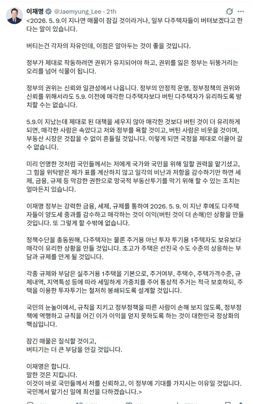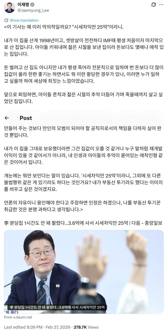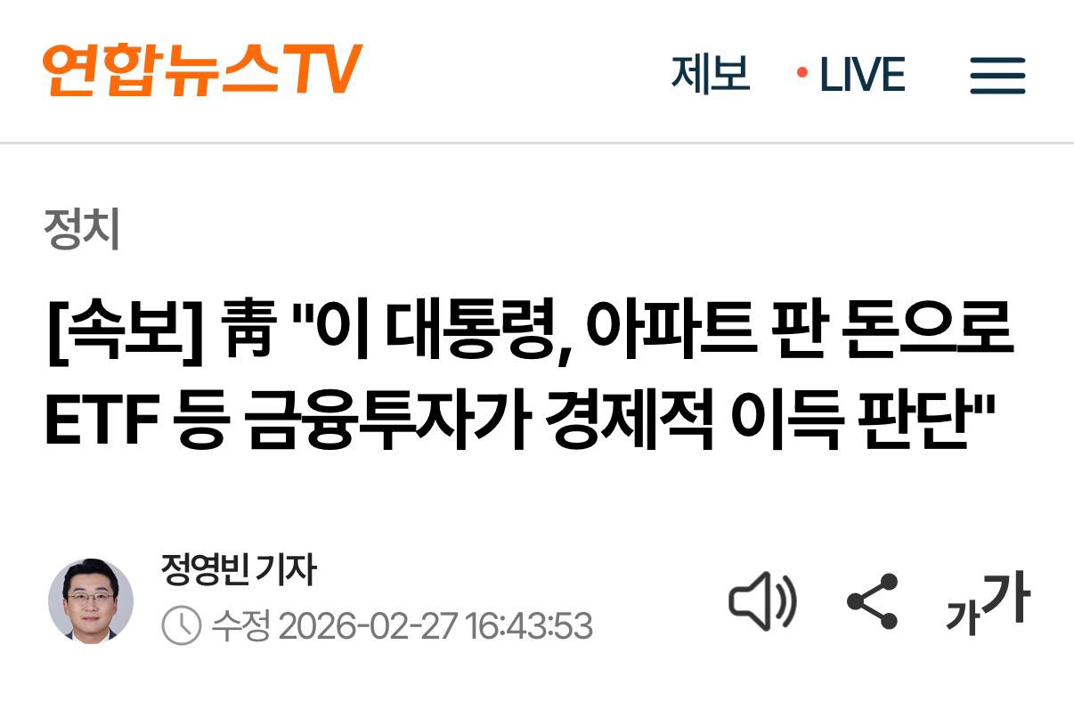 4754 정치국힘 "장동혁 5채는 매각 어려워…1채는 내놨지만 매수 문의가 없어" 11 danielbard 26/02/28 851 0