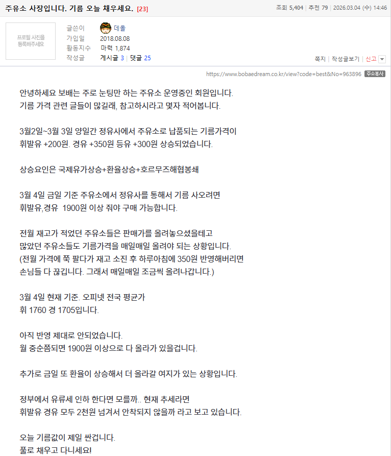 경제중동 사태에 유가 '들썩'…서울 휘발유값 1,800원 돌파 15 + |