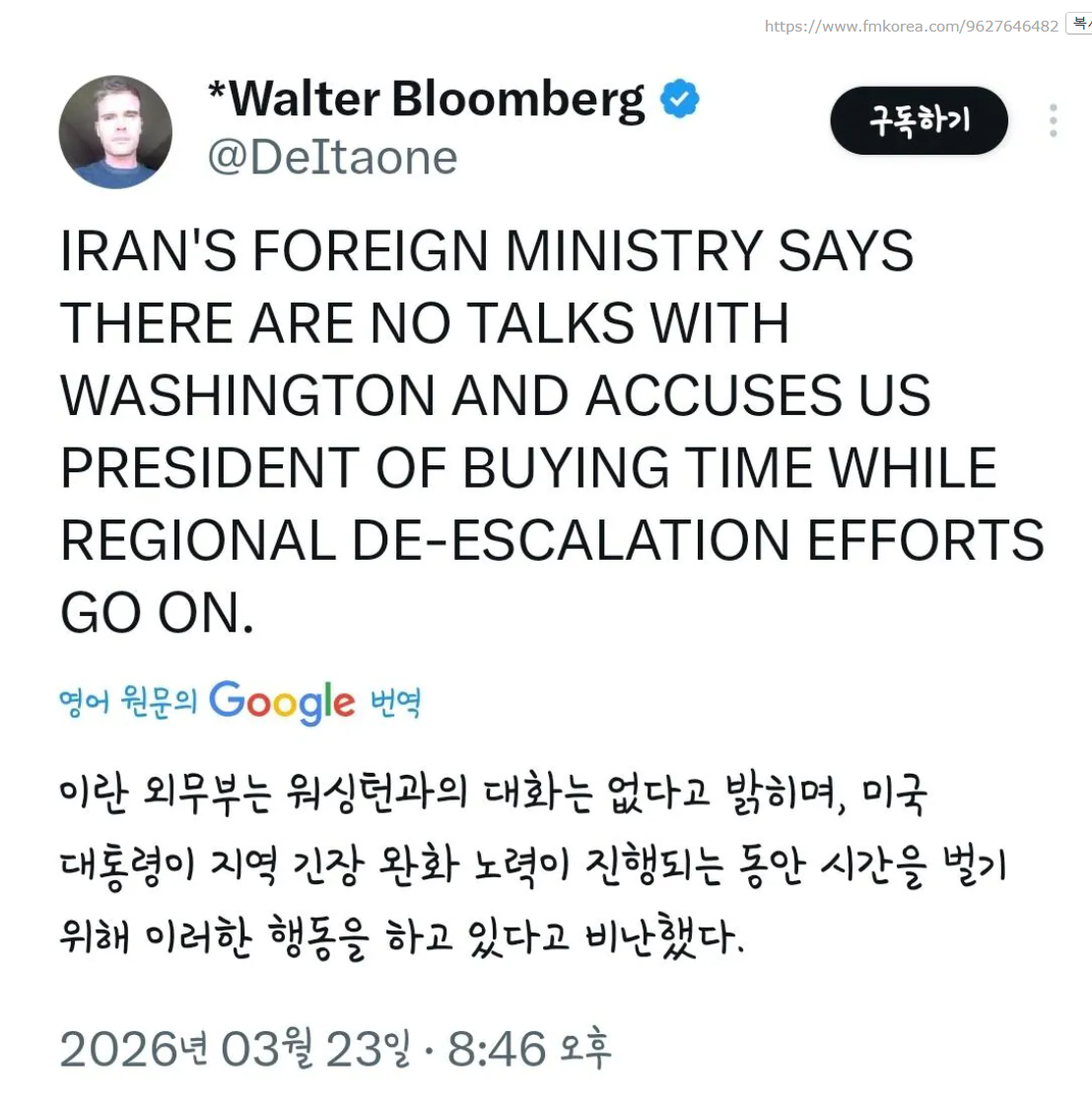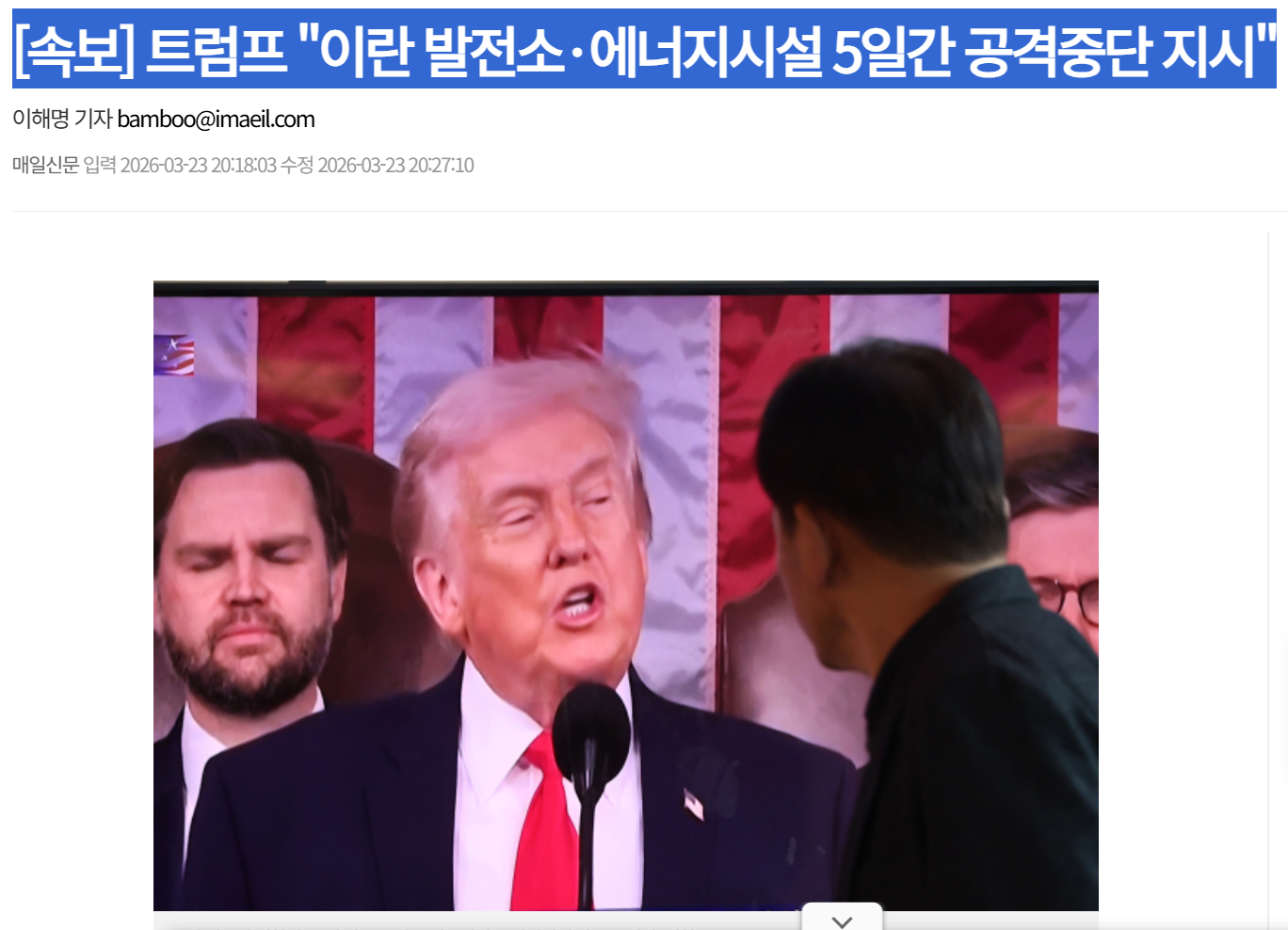 | Subject | 트럼프 "이란 발전소·에너지시설 5일간 공격중단 지시"->수정, 이란 그런적 없다. |