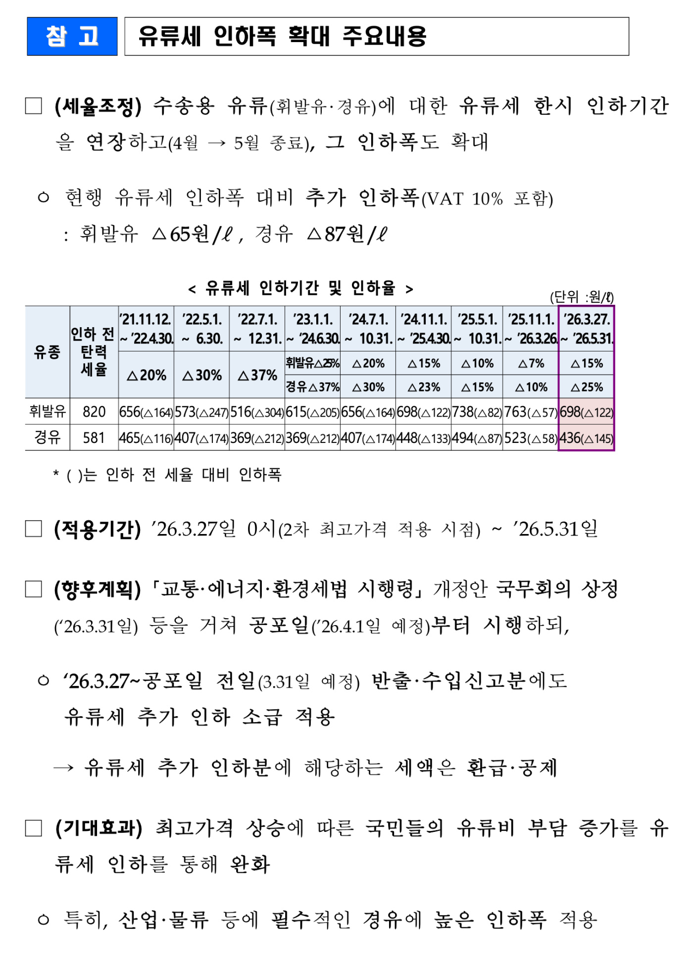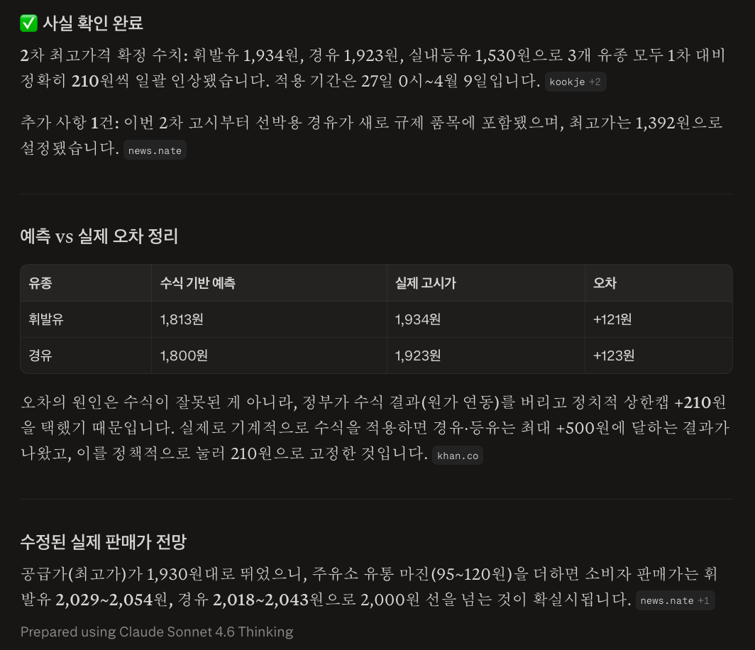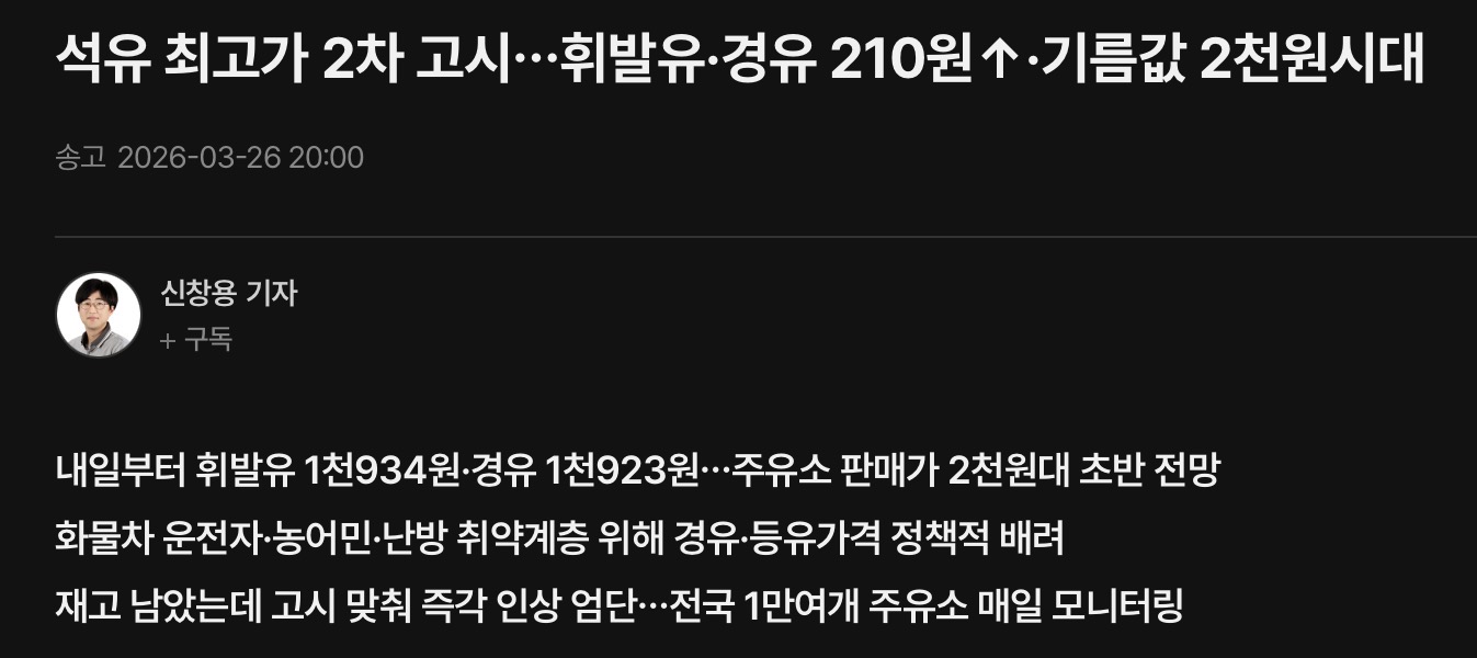 이번엔 대충 원래 이야기하던 기준(MOPS 기반)에 유류세 인하한 것과 얼추 비슷하게 나오긴 했습니다. 경유는 3월 1-2주차 평균하면 저 가격이 거의 맞긴한데 1차시절 가격 생각하면 1차 기준기간의 2주 뒤 평균가격이 아니라 5일 뒤 평균가격하고 비슷한 수준이고, 휘발유는 1-2주차 평균보단 비싸고 2-3주차 평균보다는 싼 수준이라 1차보다 약 10일 정도 뒤 평균 가격에 해당합니다. 같은 기준으로 2주 뒤에 다시 평가하면 휘발유는 2200원대 정도지만 경유는 2700원대(유류세 인하 감안시 2600원대)로 올라야 합니다. 이미 가격이 중구난방이라 엄격하게 기준대로 안 하고 살짝살짝 조정하고 있는 것은 명백하나, 3차에 여기서 크게 차이나는 가격이 나오면 초기에 말하던거와 달리 중간에 갑자기 억지써서 기준을 거의 통째로 바꾸고 있다는 이야기입니다.