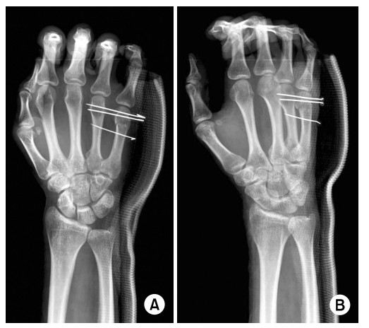 3주 전 오른손 제5수지(오른손 새끼손가락쪽) 중수골 경부골절 진단을 받고 k-강선 4개를 횡으로 삽입하는 수술을 하였습니다.