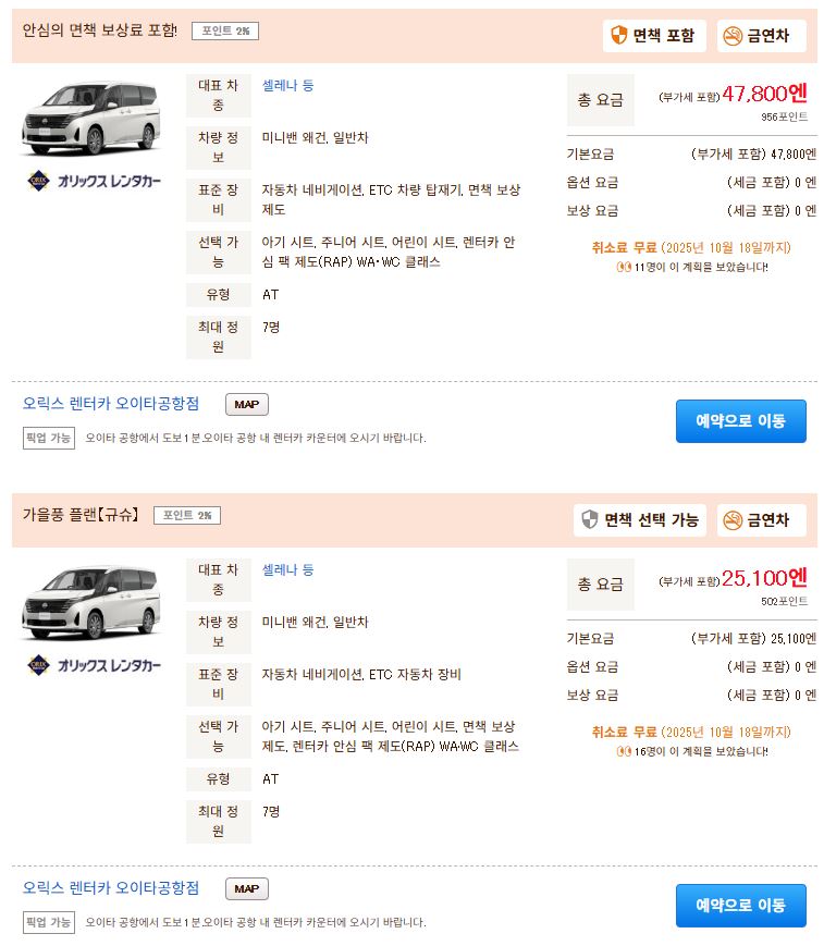 그러다가 자렌넷 쿠폰을 써서 예약하면 싸다고 해서 오늘 자란넷에서 오릭스 렌트카 세레나 급으로 쿠폰 적용했더니 28500엔 정도나와서 다시 결제를 해두었습니다.