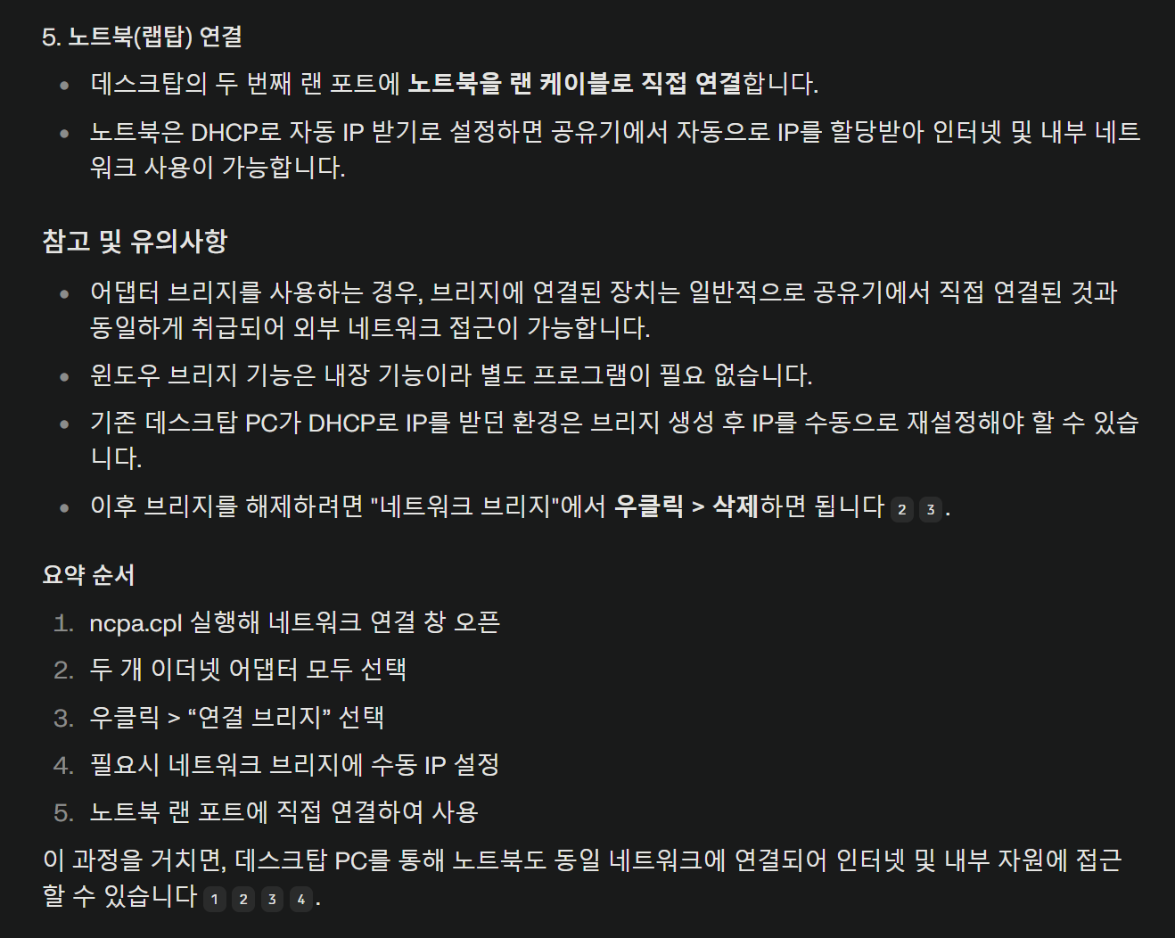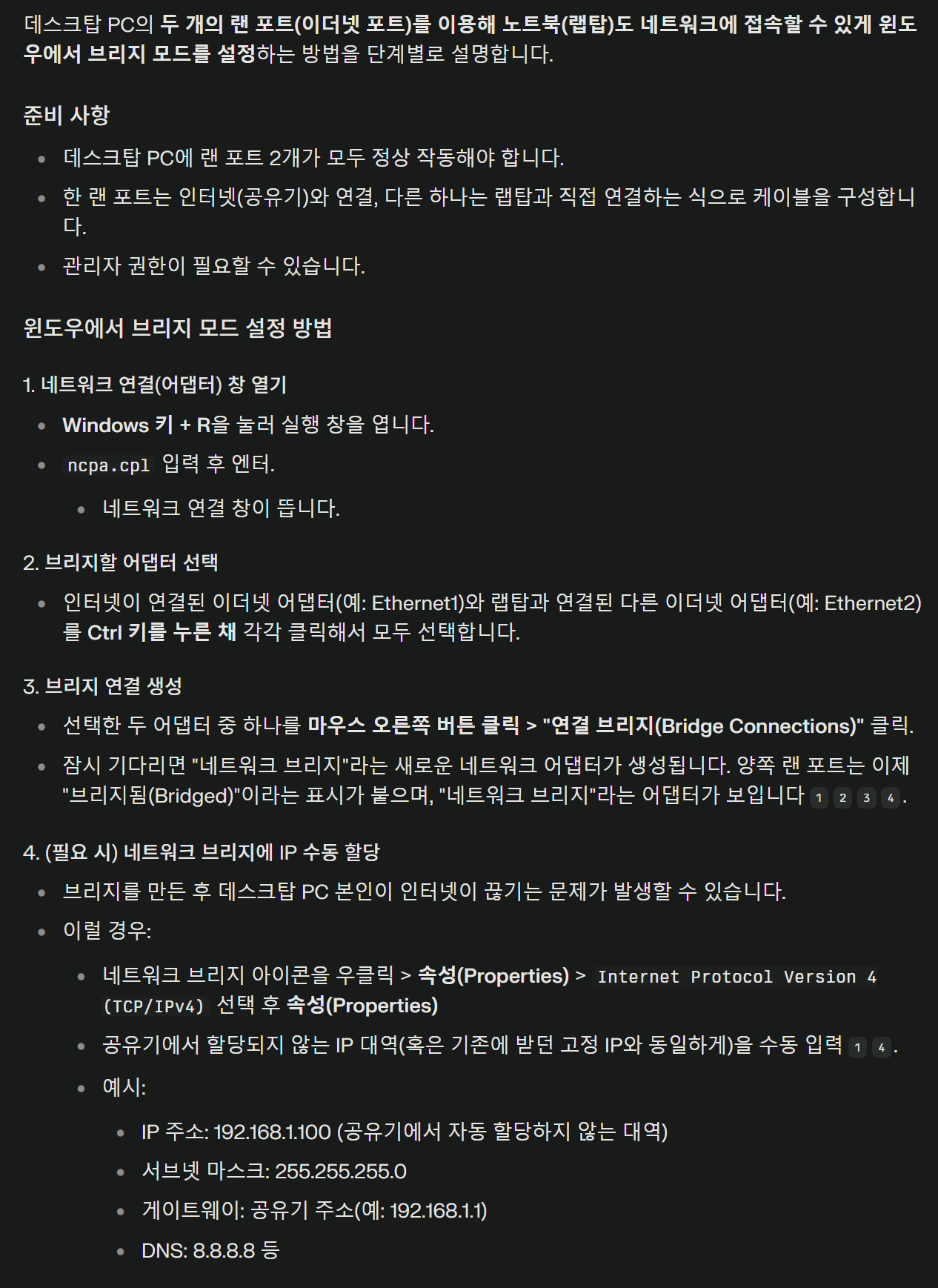 IT 고수님들 질문이 있습니다. 네트워크에 대한 이해도는 매우 낮습니다. 지금 랩탑 데스크탑을 쓰는데 유선망을 랩탑과 데스크탑 번갈아가며 써야합니다. 동시에 쓸 필요는 없지만 기기에 부여된 ip에 특정 프로그램이 방화벽 예외라 공유기처럼 자체적으로 ip를 받아 다른 기기로 뿌려주는 기기는 이용하기 어렵습니다. (제가 이해한 것이 맞을까요? ㅎㅎ) 벽 패널 랜포트는 하나여서 랜선을 물리적으로 바꿔끼고 있는데 이걸 편하게 해줄 장치를 찾고 있습니다. 단순하게는 rj45 female-female 커넥터를 사서 책상 위에서 바꾸어 끼는게 1차적 해결책이지만 물리 스위치로 바꾸어 주는 게 있으면 좋을 것 같습니다. 답변 미리 감사드립니다. 0