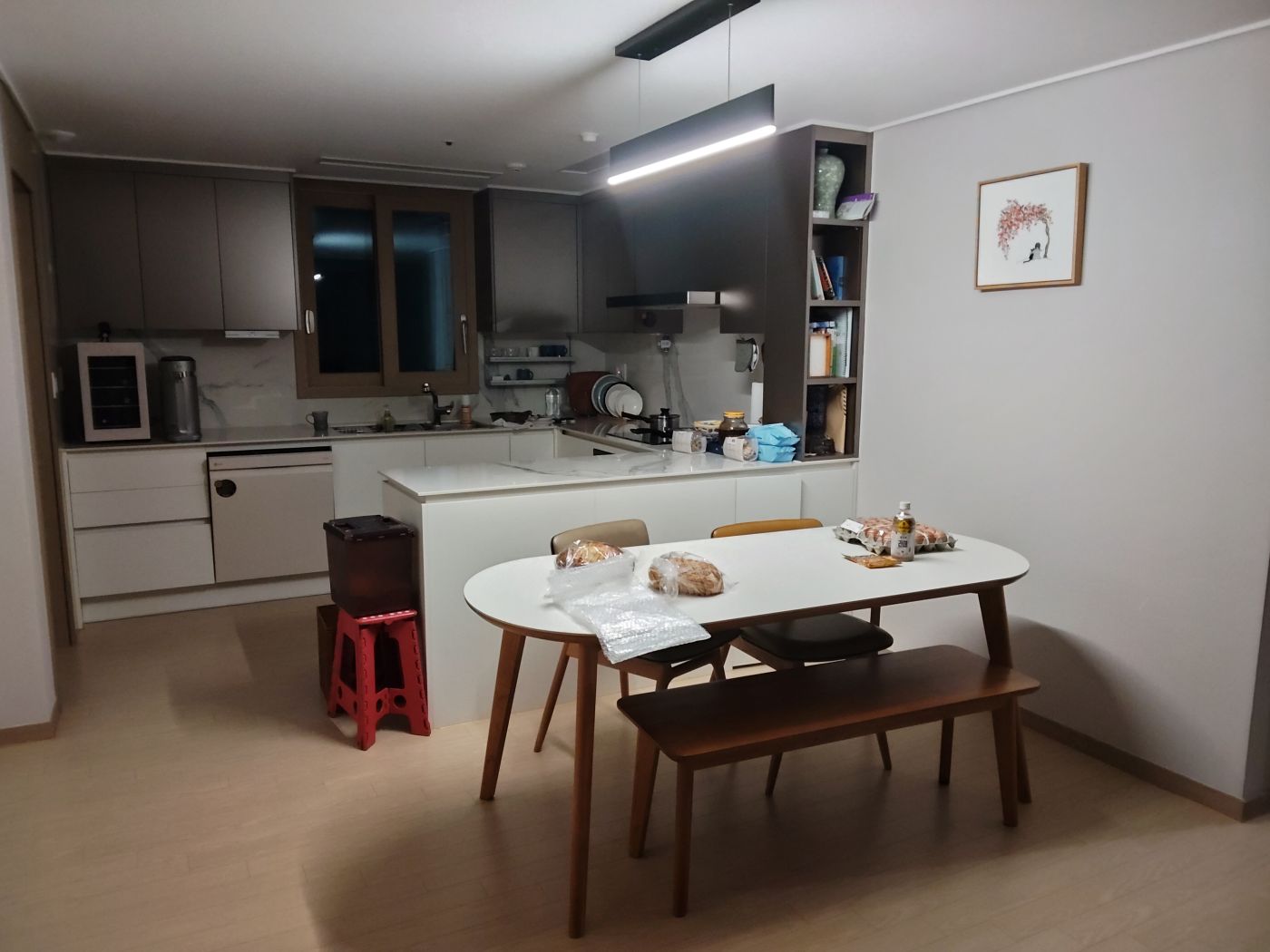 다함께 식탁에 앉으면 벽쪽에 앉은 사람이 어둡다고 난리입니다. 지금 조명이 나쁘지 않다 생각해서 일단 식탁 방향에 맞춰 90도 회전시켜 달아볼까 하는데 어떻게 손대야 할지 모르겠네요. 공사업자에게 무작정 연락해볼까요? 식탁 방향은 지금 방향이 가장 편해서 이대로 두려 합니다. 0