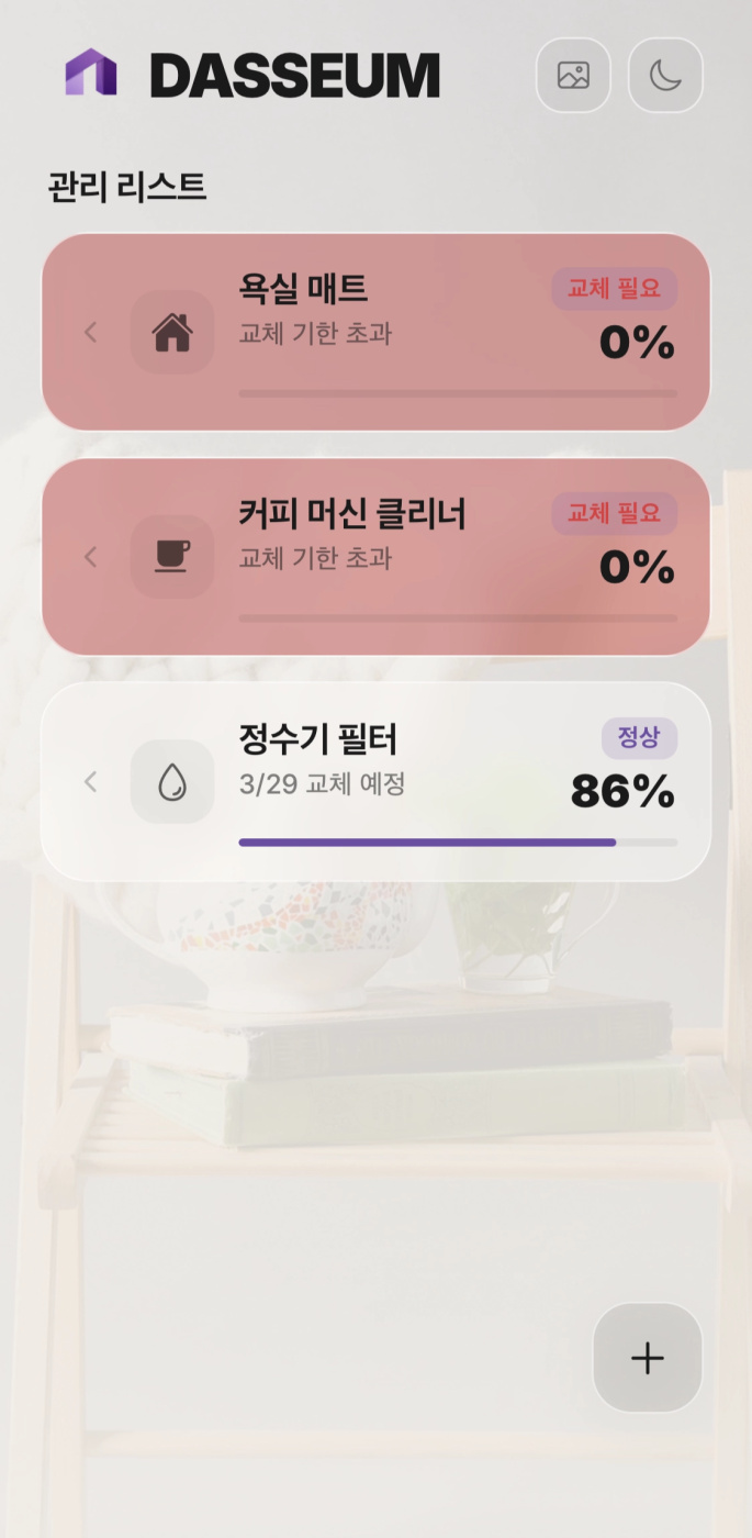 - 교체 시급 순 정렬:  보기 편하도록 교체 시기가 임박한 소모품이 제일 위에 오도록 정렬 해놓았어요