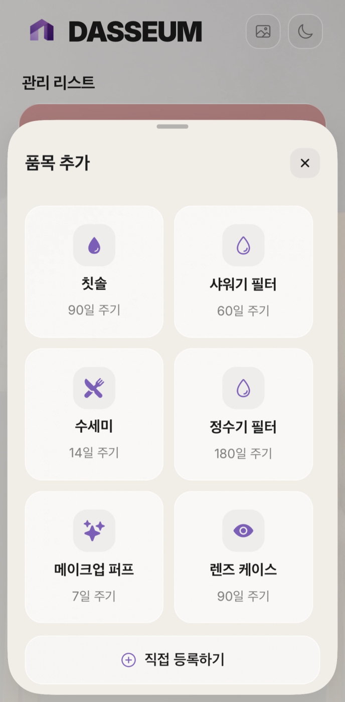 - 품목 커스텀:개인이 품목 주기를 커스텀하면 좋을 것 같다 하셔서 정해진 품목들 외에도 커스텀할 수 있게 구현 해놨습니다.