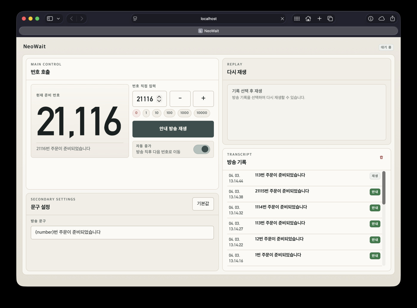 '번 손님 주문하신 음료 나왔습니다' 를 1개 만들어놓고 '일' '이' '삼' ~~~ '백' 까지만 따로 음성 파일로 만들고 번호에 맞게 '일' '번 손님 ~~~' 과 같이 재생하는 방식으로 하면 로컬 TTS모델이나 API 없이 최초 생성 이후 별도 비용 없이 가능할 것 같습니다.
