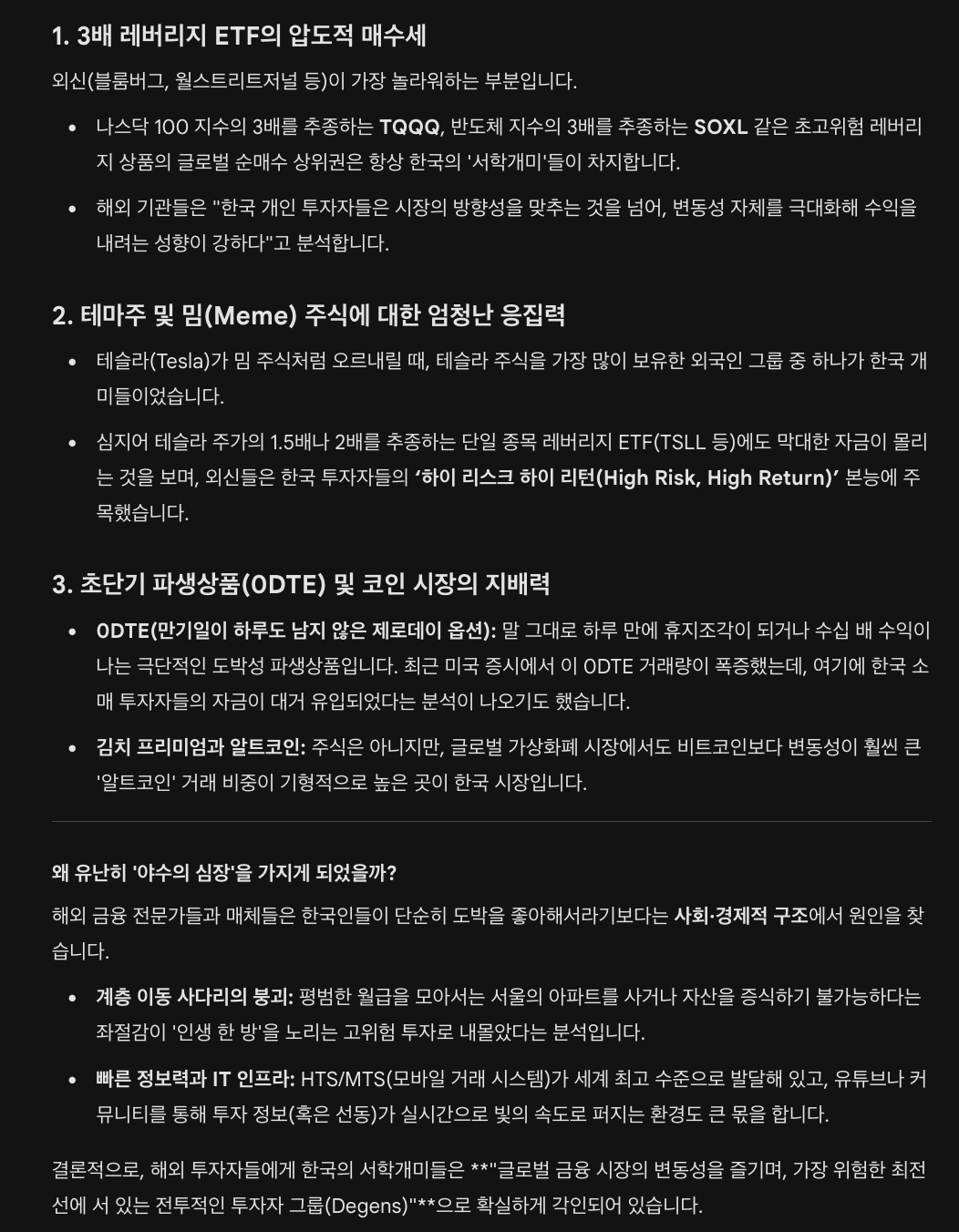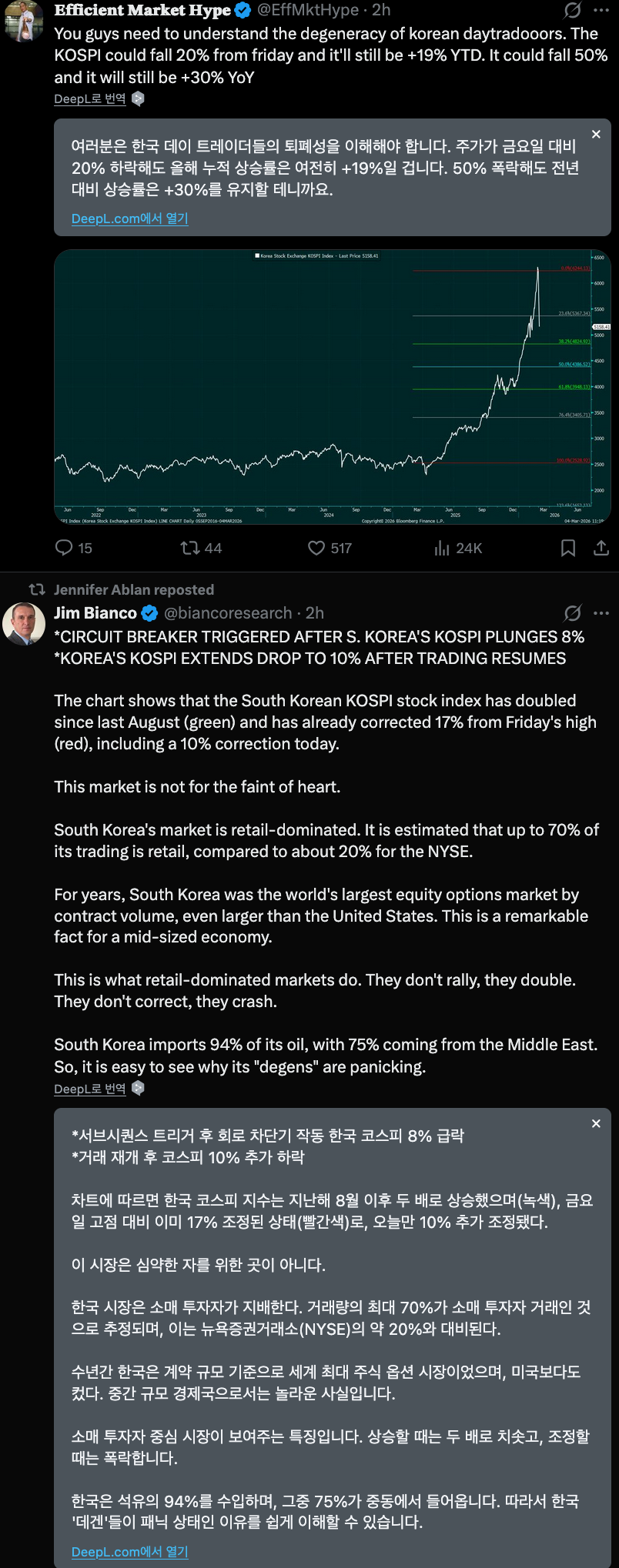 한국 투자자들의 미장 투자가 큰 것도 이제는 문제가 되어서 코스피 급락=>마진콜=>한국 개미들 미장 테크 주식 매도도 걱정하는 사람들이 이제 좀 보이더군요.