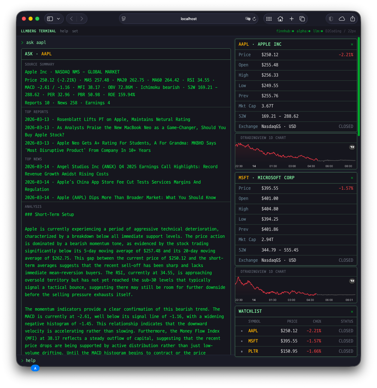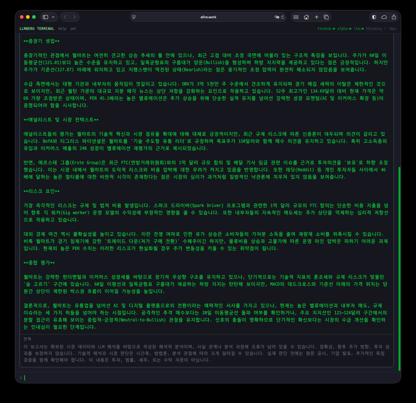 https://www.afire.work/llmberg/ (광고 없음) 안녕하십니까. 옆방에서 왔습니다. 미장한다고 새벽에 핸드폰 보고 있을 때, 할 거 없으면 자라고 등짝맞는 아픔을 가진 분이 있을 까봐⋯ 제가 쓸데 없이 geek 스러운 물건을 만들어 가지고 왔습니다. 이제 이 것을 쓰시면 몬가⋯ 몬가 본격적으로 하고 있는 사람처럼 보일 수 있습니다. (실속은 없음) 자세한 것은 접속해서 help 만 치시면 아실 수 있습니다. API 키 없이도 사용할 수 있지만, 키가 있으면 기능이 풍성해집니다. 키는 모두 무료로 구할 수 있는 것들입니다. 즐거운 투자되십시오. 7