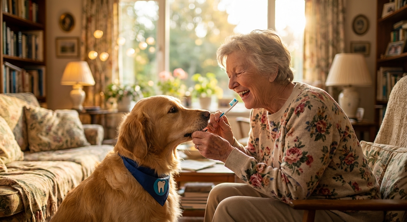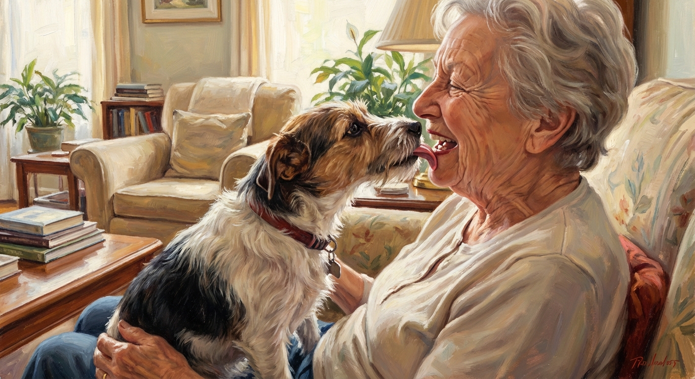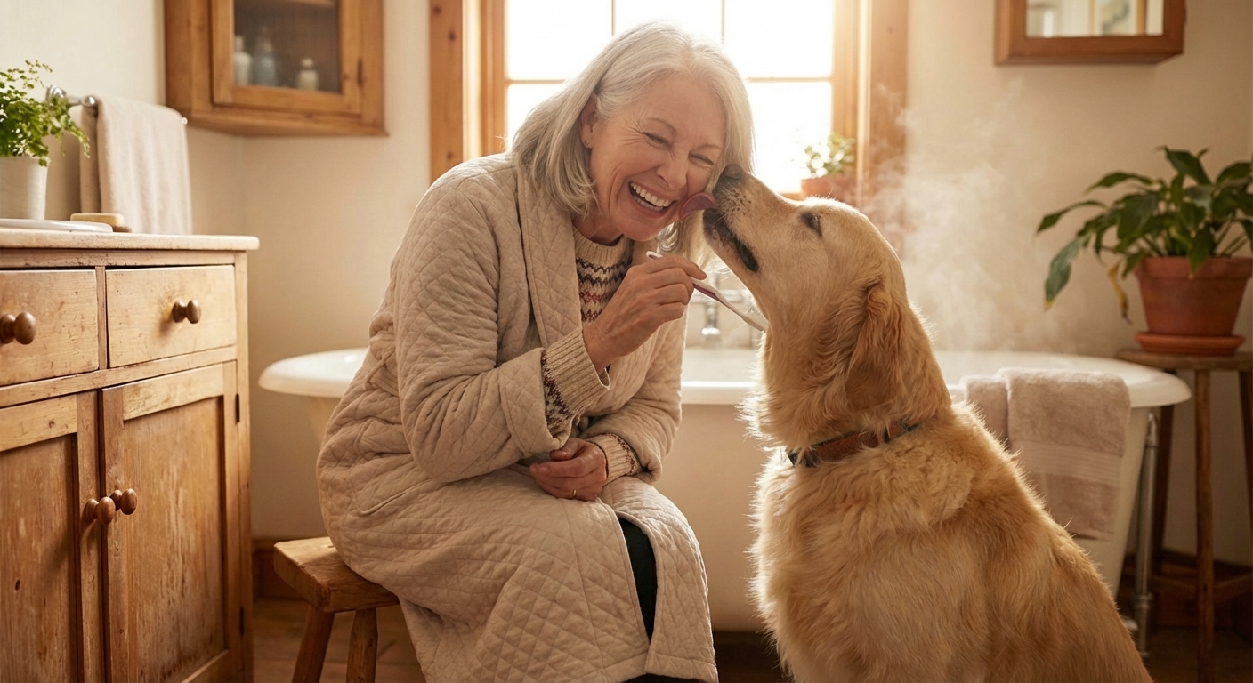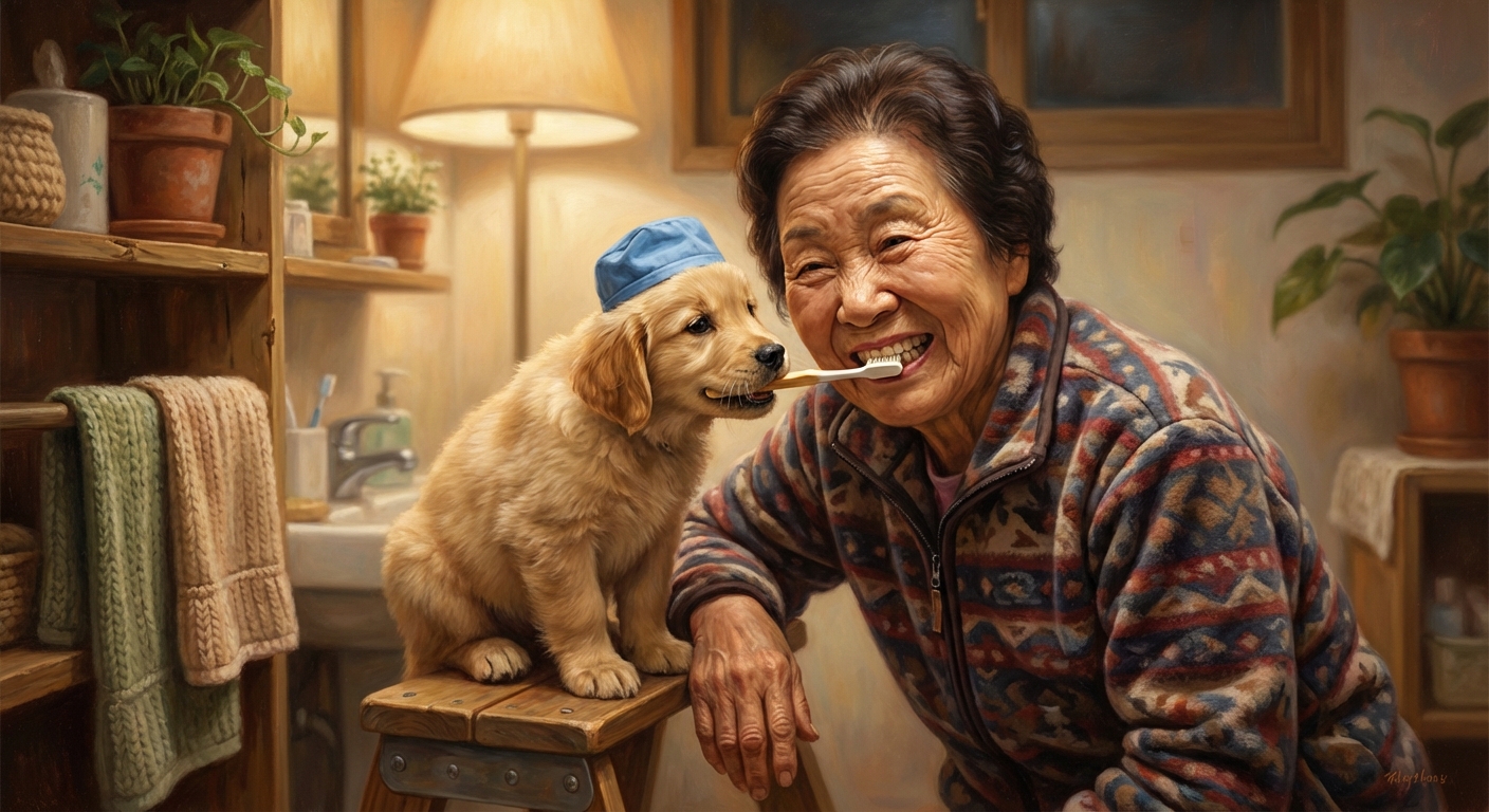 @나노바나나 강아지가 혀로 할머니 입 속을 양치해주는 그림을 사실적인 그림체로 그려주렴