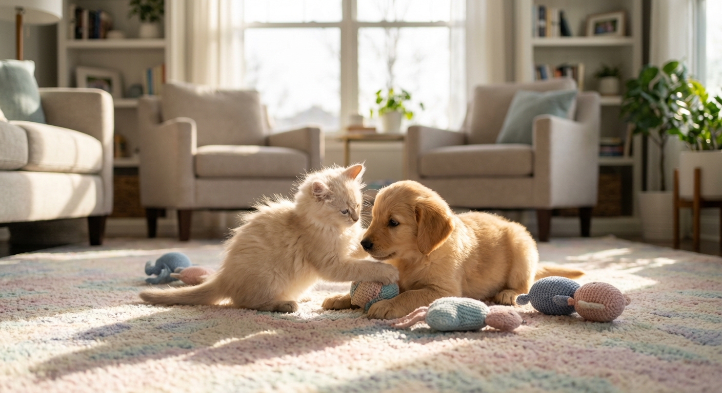@나노바나나 실내에서 귀여운 고양이가 귀여운 강아지랑 노는 풍경을 실사처럼 그려주세요