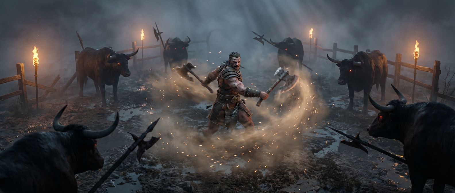 @나노바나나 디아블로2 캐릭터인 바바리안이 카우방에서 쌍수 무기를 들고 훨윈드 스킬을 쓰는 모습을 지브리 풍으로 그려줘.