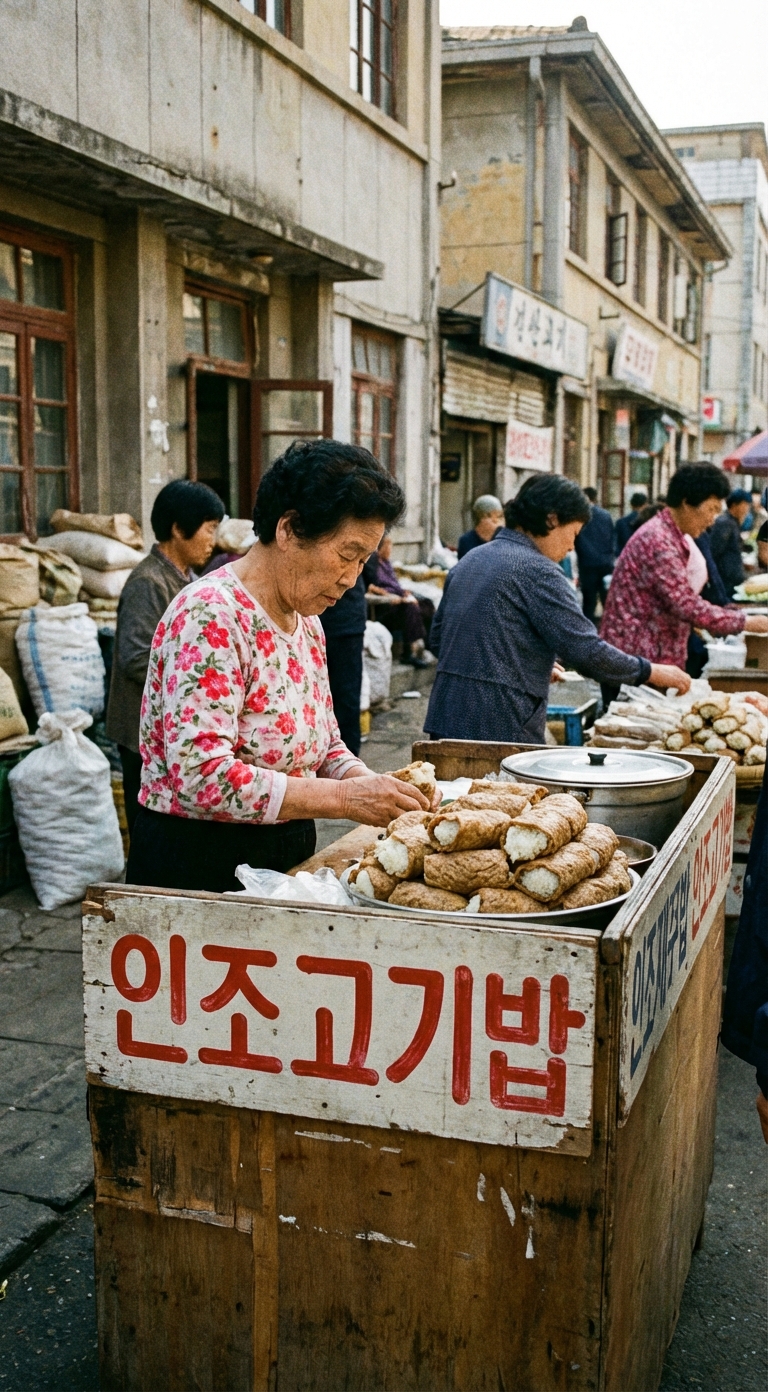 @나노바나나 카드에 넣을 일러스트로 북한의 '인조고기밥'을 그려줘. '인조고기밥'이라고 글씨를 써줘. 5:9 비율로 세로로 만들어줘.