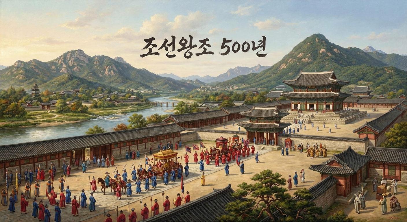 @나노바나나 숨이 멎을 듯 웅장하고 아름다운 조선시대 궁궐의 풍경, 부드러운 측광과 완벽한 명암이 어우러진 최고의 조명, 극도로 섬세하고 디테일한 묘사, 걸작 수준의 고해상도 프로 페인팅, 우아하고 역동적인 분위기의 롱 샷. 이미지의 가운데에 "조선왕조 500년" 드라마 타이틀을 붓글씨로 표시.