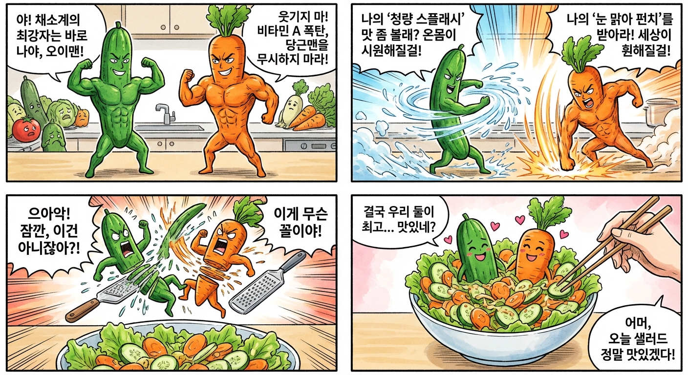 @나노바나나 오이랑 당근이 서로 내가 최강자라고 싸우는 4컷 만화를 그려줘. 대사는 한국어야.