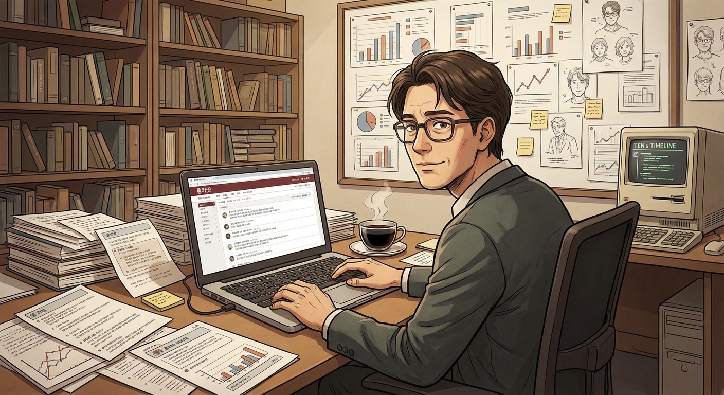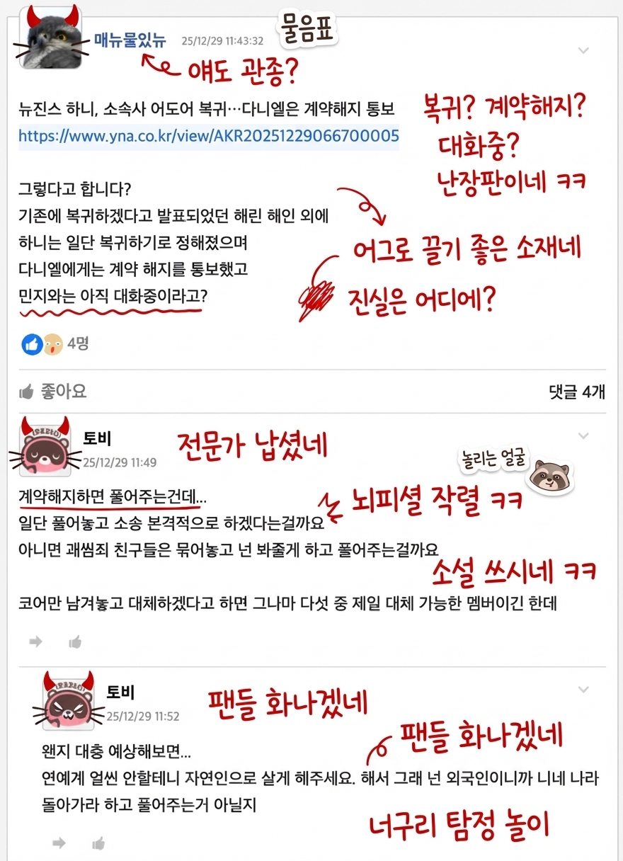 @나노바나나 After analyzing the image, use red ink to add handwritten annotations, doodles, and scribbles in Korean. If you'd like, you can use content from this account to make fun of him through doodles, and even cut out and paste small stickers.