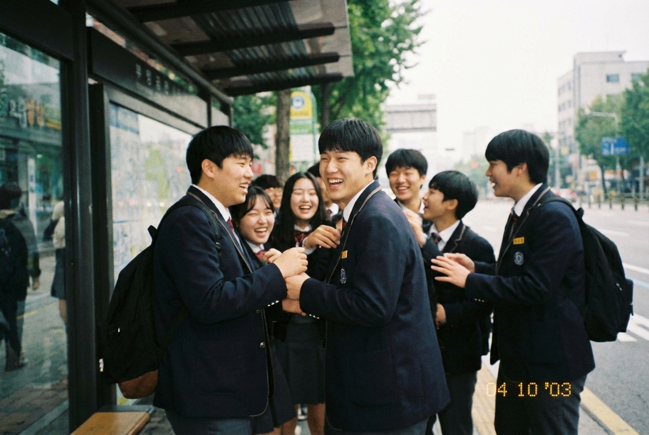 A snapshot of everyday life, taken with a low-quality disposable camera. A clumsy photo taken by a Korean high school student. (3:2 aspect ratio recommended)