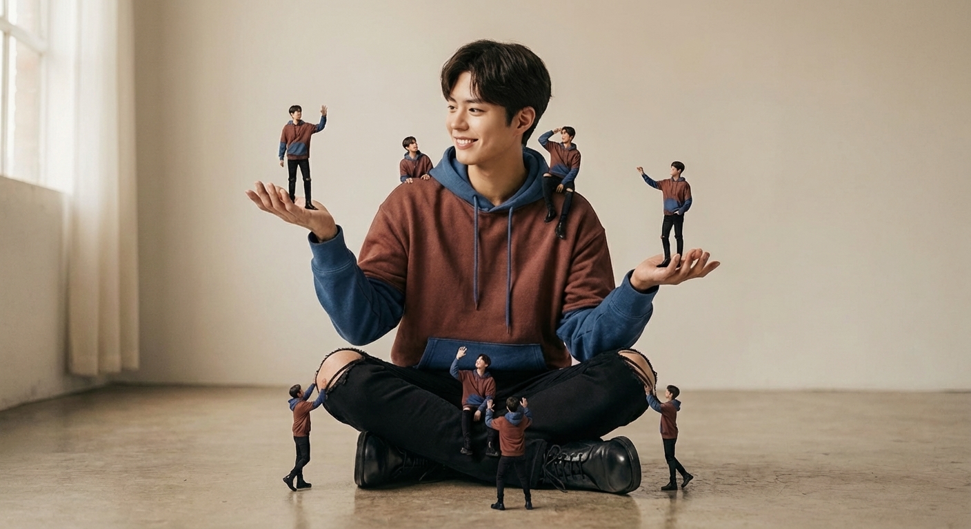 Creative surreal portrait of a man sitting on the floor wearing a brownish red blue hoodie, ripped black pants, and boots, surrounded by several miniature versions of himself. Several smaller versions stand on his hands, shoulders, and around him on the floor, interacting playfully with the larger versions. The light gray background is minimalist, clean and simple. The lighting is soft and cinematic, with realistic shadows and depth of field.