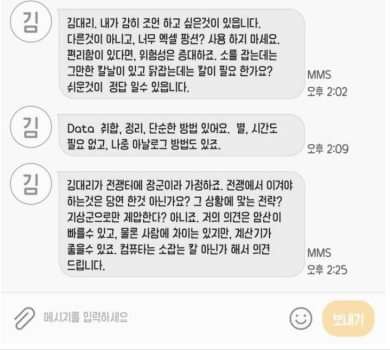 제목대로입니다 ㅎㅎ 아직 나이는 20대 중반이지만 인턴도 해보고 행정병도 해봤습니다. 주로 엑셀 관련 일만 주구장창 했구요. 몇 시간 심지어 며칠 걸릴 일을 몇 분으로 줄였을 때 그 쾌감이 너무 좋았습니다. ㅋㅋㅋ 데이터를 체계적으로 정리해서 효율이 올라가면 뿌듯하고 칭찬듣고 그맛에 계속 공부하고 그랬네요. 아무 질문이나 괜찮습니다. 주로 무슨 함수를 쓰는지 지금 하는 업무가 이건데 어떻게 효율적으로 만들지 어떻게 공부했는지 실무에 자주 쓰이는 스킬이 어떤건지 이런것도 괜찮습니다. 0