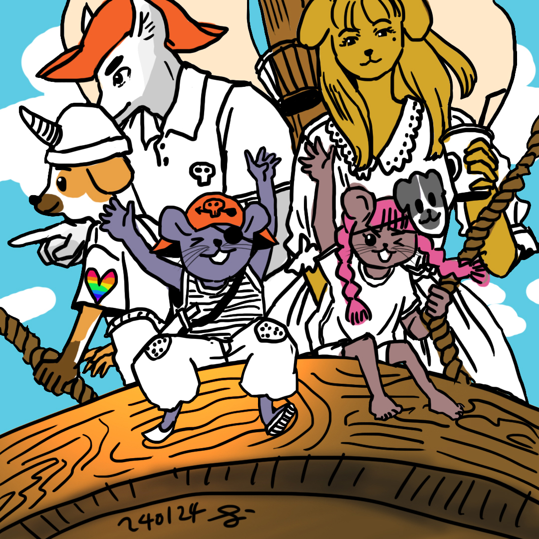 새앙쥐들은 막내들입니다. 하나는 해적모자에 칼을 찬 개구쟁이 남아 생쥐, 하나는 강아지 모자?탈?을 여아 생쥐.