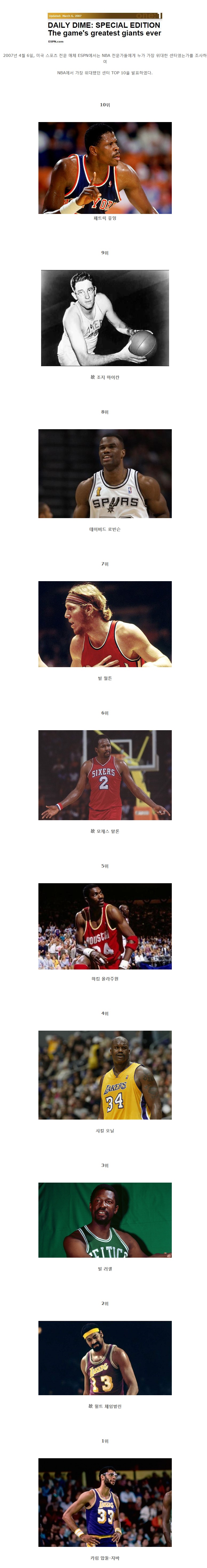 Subject   NBA에서 가장 위대했던 센터 TOP 10