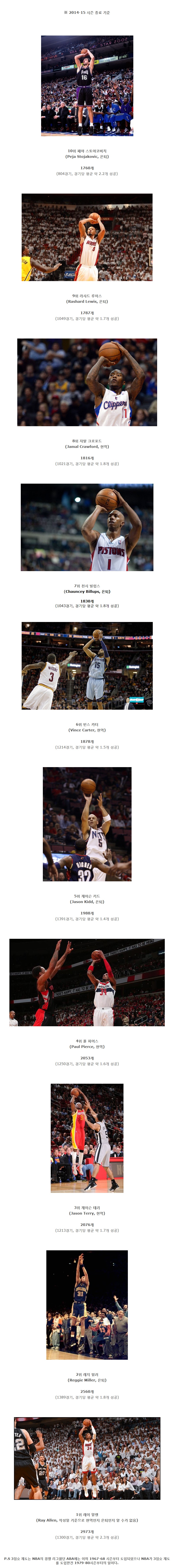 | Subject | 역대 NBA 통산 정규시즌 3점슛 성공갯수 순위 TOP 10 |