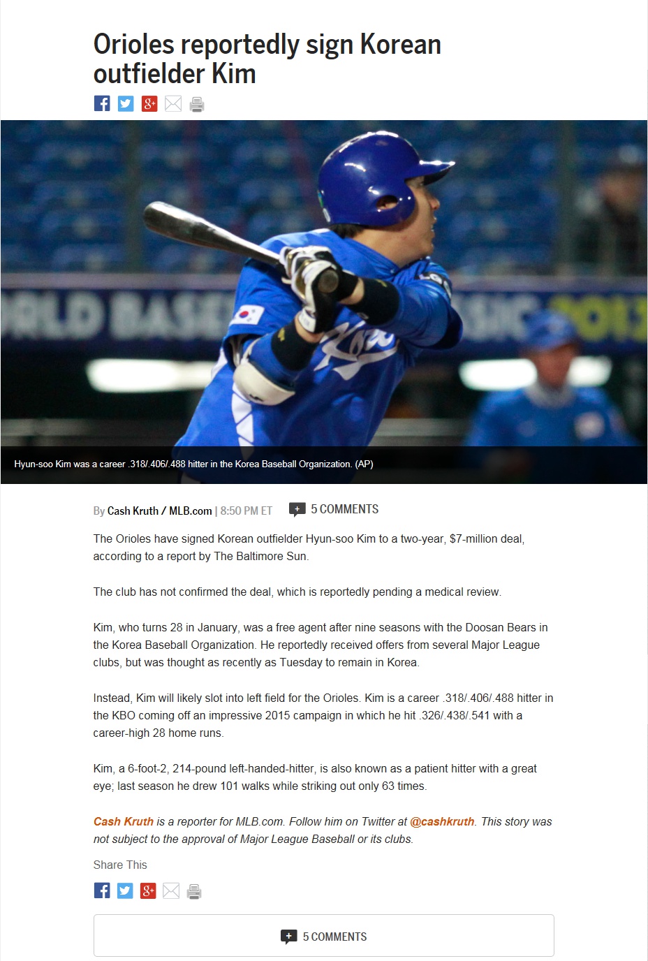 Subject   [MLB] 김현수 계약 합의 볼티모어 2년 7M