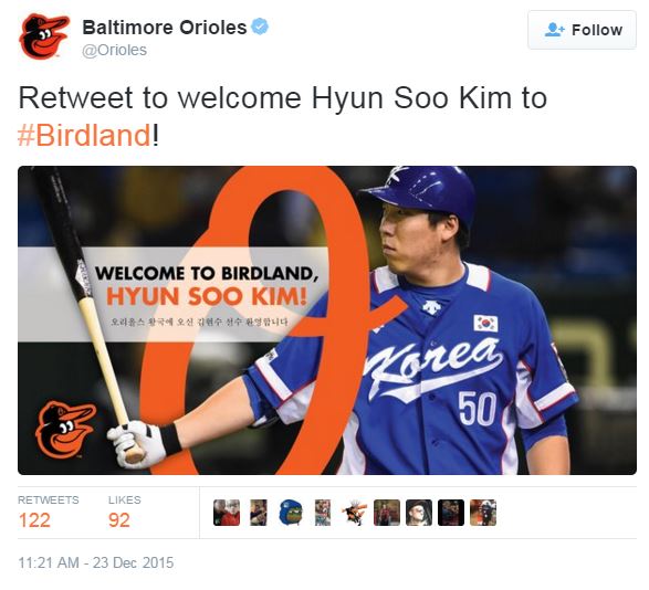 "@Orioles: The Orioles have signed free agent OF Hyun Soo Kim to a two-year contract."