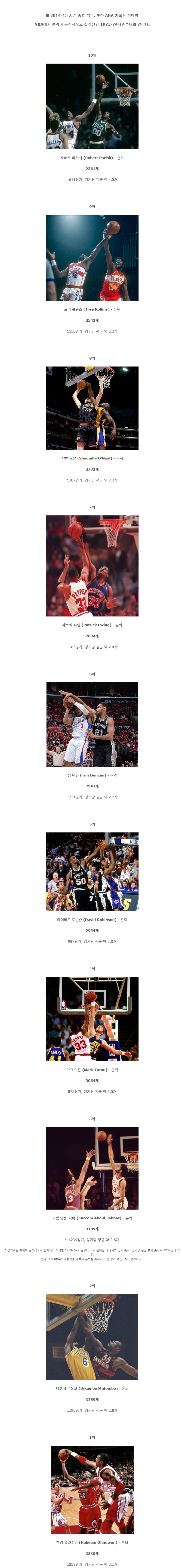 역대 NBA 정규시즌 통산 블럭 TOP 10