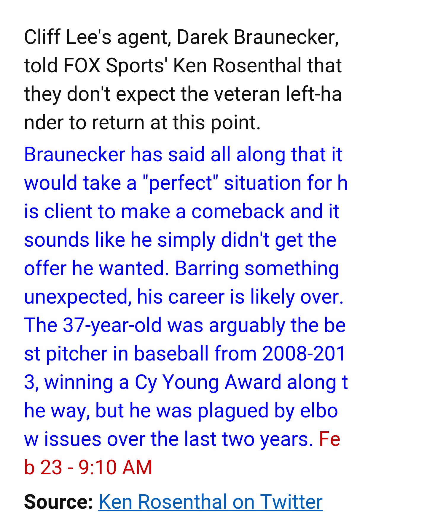 켄 로젠탈 트윗을 통해 클리프 리가 은퇴를 하네요