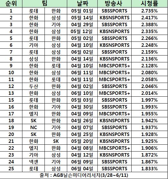 Subject   3/28 ~ 6/11까지의 프로야구 시청률 Top.24
