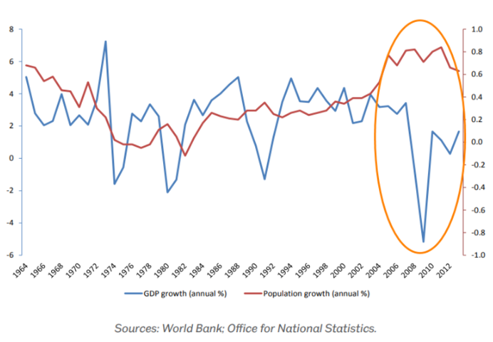 The type of jobs that the UK now tends to create – low-paying jobs in the services sector (Berry, 2014) – helps to explain the change. Rapid population growth, outpacing productivity, is incentivising firms to concentrate in labour-intense but low value-added industries.