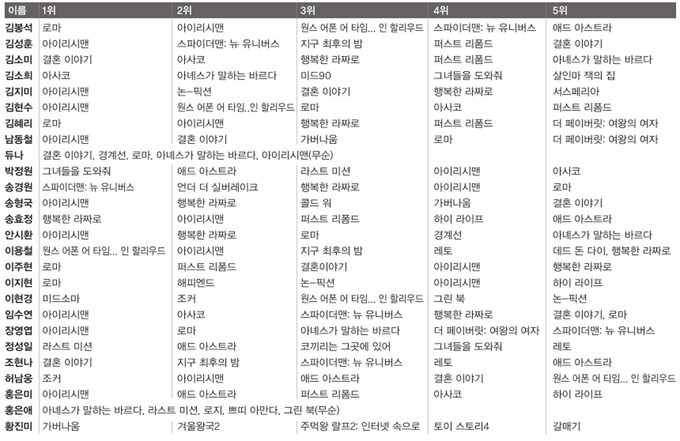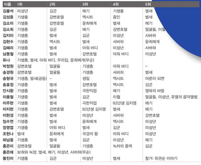한국영화에서는 당연할 수도 있겠지만, 기생충이 거의 몰표를 받았네요. 개봉 당시 단순 오락영화 취급을 받던 엑시트가 9위에 위치한 것도 인상적입니다.