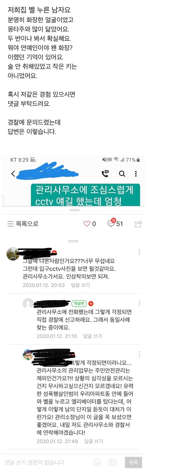 모르는 사람이 얼굴 가리고 벨을 눌러대면 진짜 무섭긴 할꺼 같네요. 무슨 괴담에나 나올 장면인데.