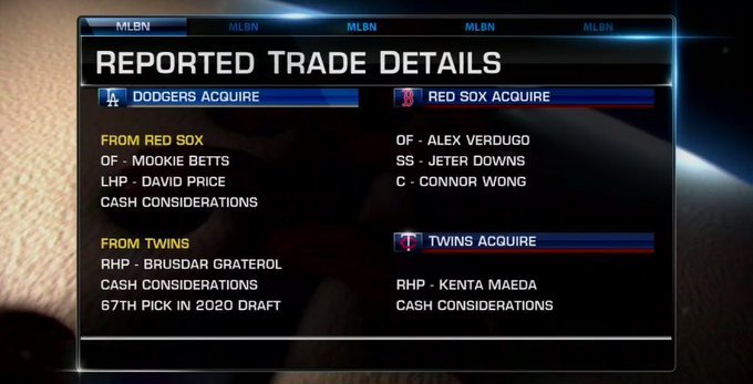 LAD-BOS LAD get: 베츠,프라이스,48M 연봉보조 BOS get: 버두고,다운스,웡 LAD-MIN LAD get: 그라테롤,레일리,67번픽 MIN get: 마에다,마이너리거,10M LAD-LAA:X 안녕하세요 김치찌개입니다! 다저스는 보스턴으로부터 베츠,프라이드를 얻었고 피더슨은 에인절스에 안가고 다저스에 남네요 올시즌 다저스 타선 엄청나네요 우승한번해야하는데 말이죠~ 마에다 다저스에서 고생했으니 미네소타에서 선발로 좋은모습보여주길! 0