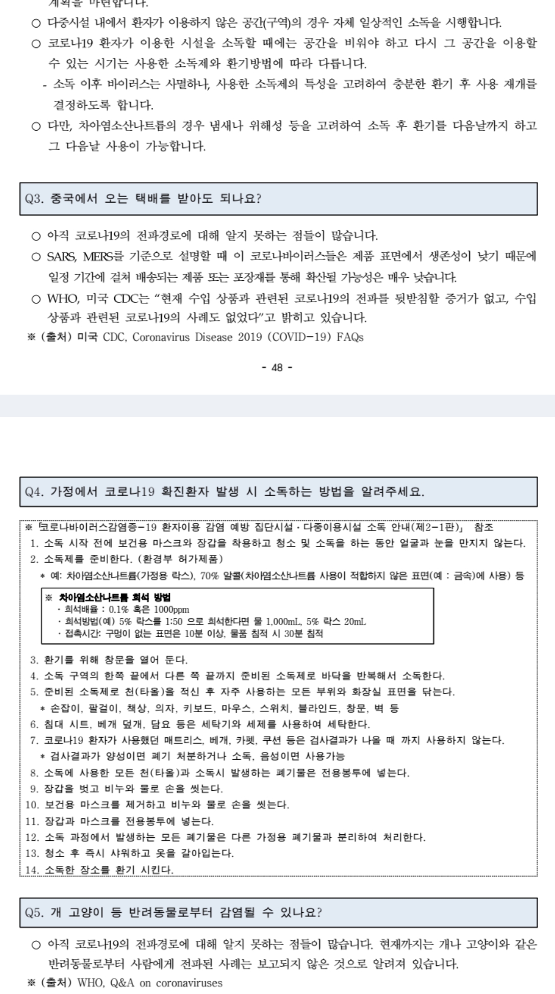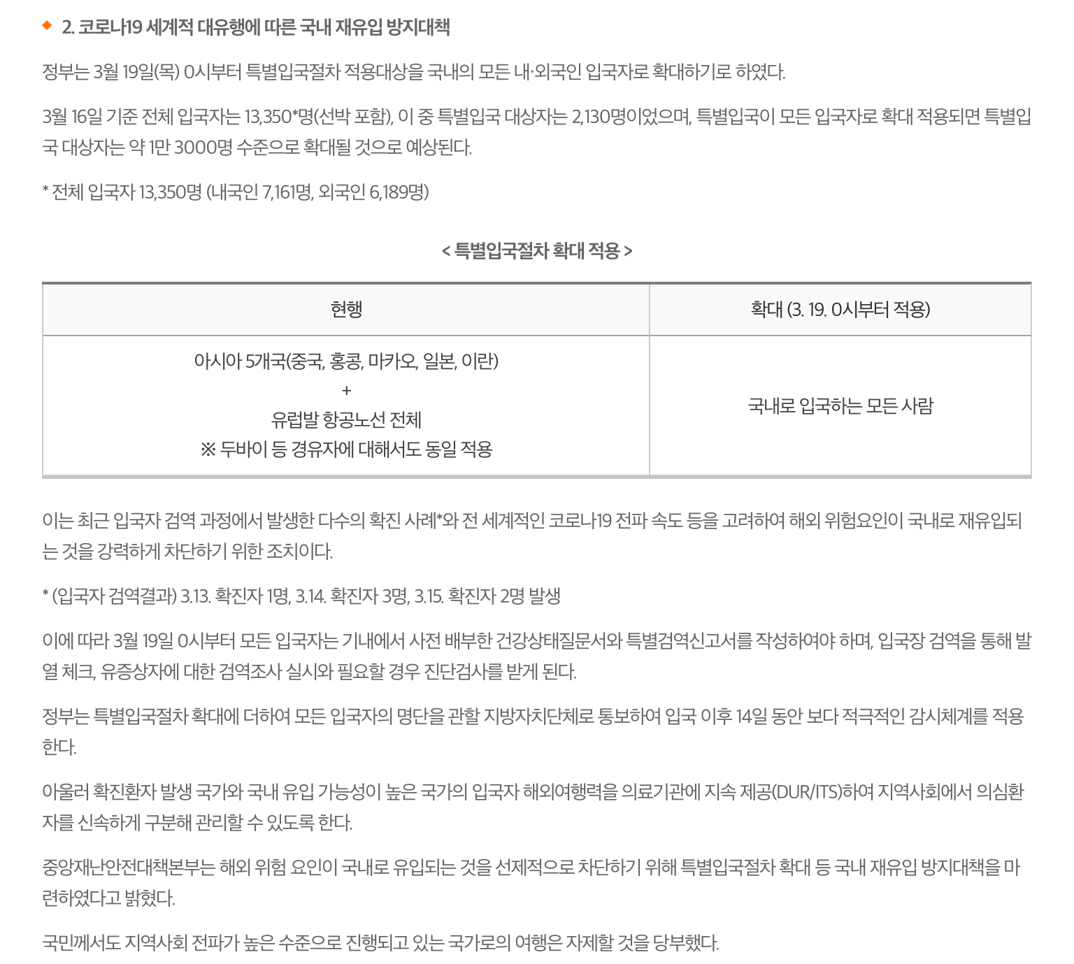 코로나바이러스감염증-19 국내 발생 현황 (정례브리핑) https://www.mohw.go.kr/react/al/sal0301vw.jsp?PAR_MENU_ID=04&MENU_ID=0403&page=1&CONT_SEQ=353594 https://youtu.be/0Yld-cKTSG8 (KTV 오늘 영상은 통으로 라이브 영상이라 시간이 자꾸 바뀌어 연합뉴스 유튜브로 소개합니다.) 매일 하는 브리핑입니다만, 오늘 주목할 부분은 해외 유입, 검역에서 걸러진 확진자 수가 증가하는 부분과 말미에 재차 강조하지만, 경기도 상황이 심상치 않다는 점 같습니다. 기자들은 과거 중국발 입국 금지 논란 때처럼 이제는 외국발 입국 금지 조치 여부에 관심을 주로 기울이는 것 같습니다. 앞으로 언론 등을 통해 주로 이 부분이 논란이 될 것 같습니다. 우리나라는 19일부터 전세계로 특별 입국 관리 절차 대상을 넓힐 예정입니다. 입국과정 검역에서는 계속 확진자가 안 나오다가 최근에 늘기 시작했는데, 17일 0시 기준으로 누적 55명(내국인 47명)의 확진 환자가 나왔다고 합니다. 17일 0시 기준 검역 확진자는 4명에서 6명으로 바뀜. 한편, 지침 7-3판이 올라와 있습니다. 관심 있는 분들은 참고하시면 좋을 것 같습니다. 코로나바이러스감염증-19 대응지침 https://www.cdc.go.kr/board/board.es?mid=a20507020000&bid=0019# 일반 개인들은 부록 13의 자주 묻는 질문 등을 참고하시면 좋을 것 같습니다. 가정 소독법 등도 나와있습니다.(부록 39~49쪽) 1
