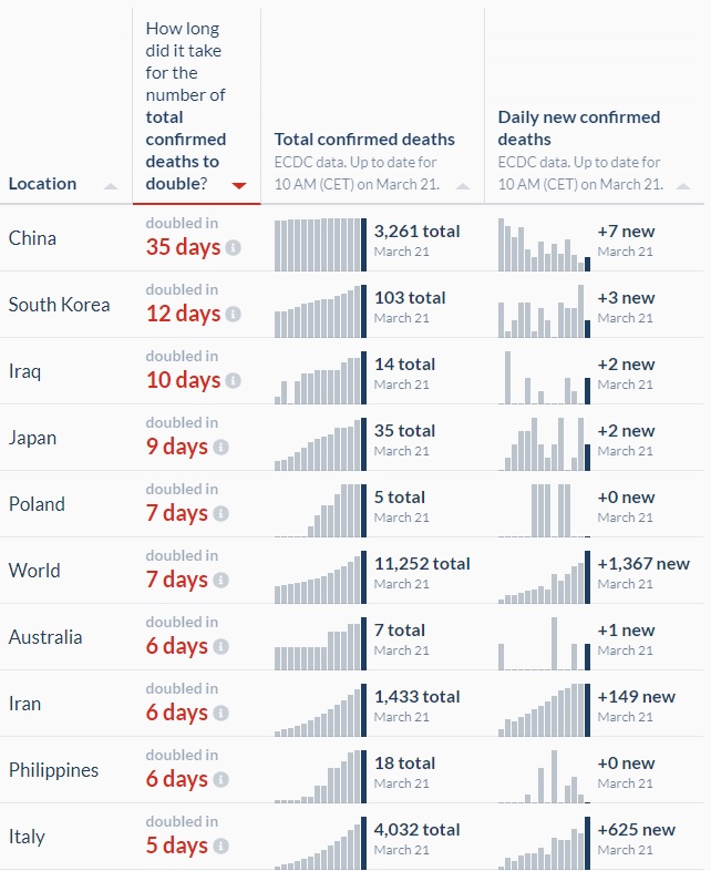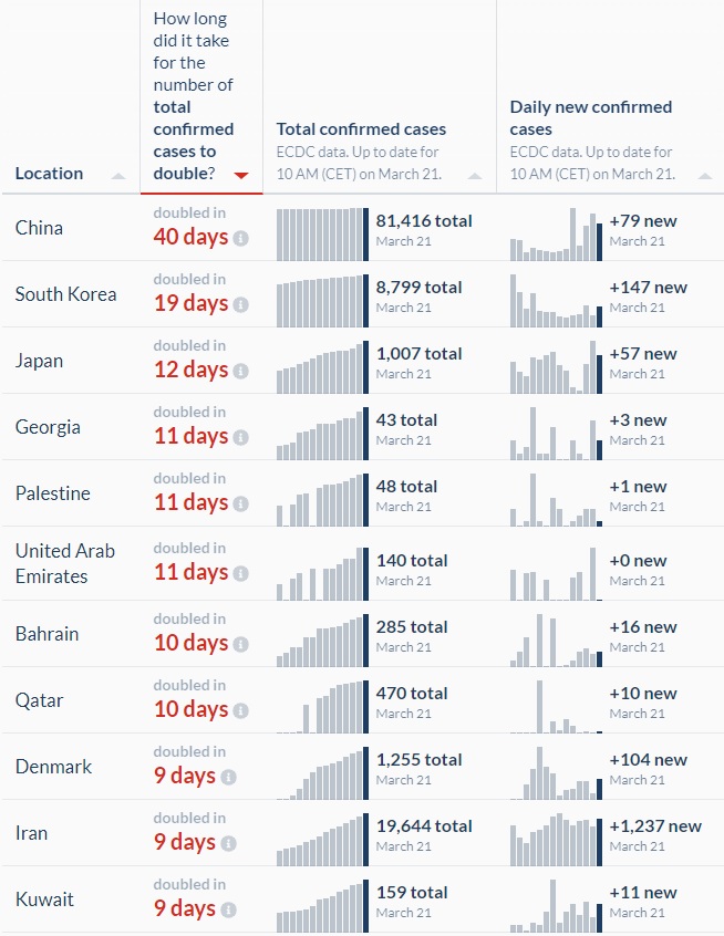 이 두 장의 사진은 일전에 타임라인에서 소개해드렸던 [더블링타임]입니다. 위쪽은 사망자가 두 배가 되는데 걸리는 시간, 아래쪽은 확진자가 두 배가 되는데 걸리는 시간입니다. 두 수치 모두에서 챠이나 남바완이고 대한민국은 남바투를 기록하고 있습니다. 세계에서 코비드 확산 속도가 가장 느린 두 나라 (...)가 되겠습니다. 두 도표 모두 하단부가 짤려서 안나오는데 이탈리아의 경우 확진자 더블링타임은 6일, 사망자 더블링타임은 5일입니다. 이게 며칠 전에는 3~4일 수준이었는데 이제 많이 늦춰졌지요. 신규 사망자와 확진자의 절대값은 매일 최고치를 찍고 있지만 '확산세' 자체는 이미 꺾였음을 알 수 있습니다. 반대로 절대값 자체는 이탈리아만큼 무섭지 않더라도 엄청난 속도로 확산하고 있는 나라들도 있습니다. 미국, 영국, 독일 등이 대표적인데, 사망자 더블링타임의 경우 각각 3일 3일 2일이고, 확진자 더블링타임의 경우 각각 2일 3일 2일입니다. 그 외에도 방역의 성공사례로 꼽혔던 대만의 확진자 더블링타임이 4일, 호주 4일, 싱가폴이 8일입니다. 대만의 페이스가 이탈리아보다 빠르다는 게 인상적입니다. 그동안 잘 막는 것처럼 보였던 게 단지 뒷줄에 서서 자기가 맞을 차례를 기다리고 있었던 게 아닌가...하는 의심을 해볼 수 있겠습니다. 어쩌면 지금은 유럽 망했다고 난리지만 3주 정도 지나면 유럽 사람들이 삼삼오오 모여서 "다시 보니 우리는 선녀네" 하게 될지도 모르구요. 이건 검사횟수를 국가별로 나누어본 겁니다. 여러분이 직접 이 도표 상에서 Add country를 눌러서 비교해보고 싶은 국가를 쉽게 추가할 수 있습니다. 자료가 없어서 그렇지 검사 횟수만 가지고 보면 중국이 압도적 1위일 겁니다. 중국 빼고는 한국이 1위지만 우리나라 검사횟수 자체는 계속 감소추세라 머지않아 다른 나라들에게 자리를 비켜줄 것으로 예상됩니다. 그나저나 갓-본의 검사횟수는 여기서도 누네띠네요. 이것도 재밌는 그래프인데, 검사횟수대비 확진자수를 로그스케일로 정리한 결과입니다. 대충 이쁘게 우상향이네요. 많이 검사하면 확진자가 많이 나오고 적게 검사하면 확진자가 적게 나온다는 말은 사실이었습니다 (충격). 이것 역시 전세계 확진자 증가추이를 로그스케일로 그린 그래프입니다. 플레이버튼을 눌러보시면 대륙별로 터지는 시점이 각자 뭉쳐서 나온다는 걸 알 수 있습니다. 아시아가 먼저 터지고 유럽이 터지고 북미가 터지고.. 아마 남미나 아프리카나 기타 대륙도 끝내는 순서대로 터지지 않을까 예상해볼 수 있습니다. 10