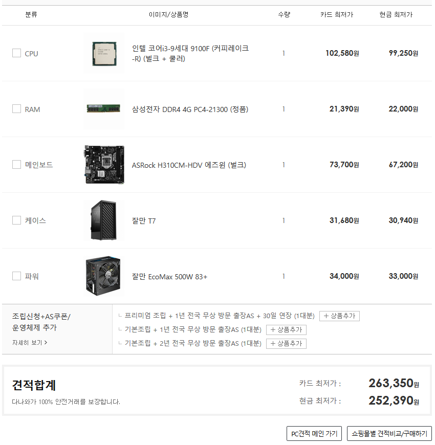 댓글에서 알려 주신 대로 AMD로 구성해 봤습니다. 제가 고른 i3가 그래픽 기능이 없는 놈이었군요. 묻지 않았으면 고생할 뻔했어요 :)