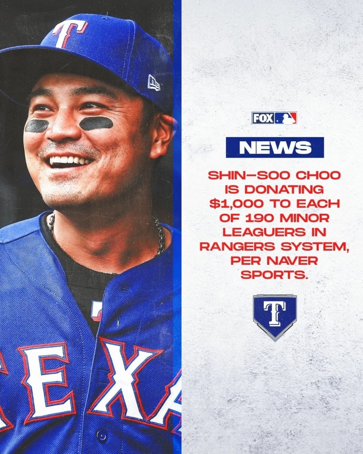 https://sports.news.naver.com/news.nhn?oid=380&aid=0000001380 안녕하세요 김치찌개입니다! 구단 산하 190명의 마이너리그 선수에게 1인당 1,000달러 기부 한국돈으로 2억 3천만원 추가적으로 화이트에게는 매주 자신에게 지급되는 식비를 야구가 중단되는 기간까지 모두 보내주겠다고 약속했고요 텍사스 선수들이 팀리더라고 하는 이유가 있었네요 대단하네요 추신수! 2
