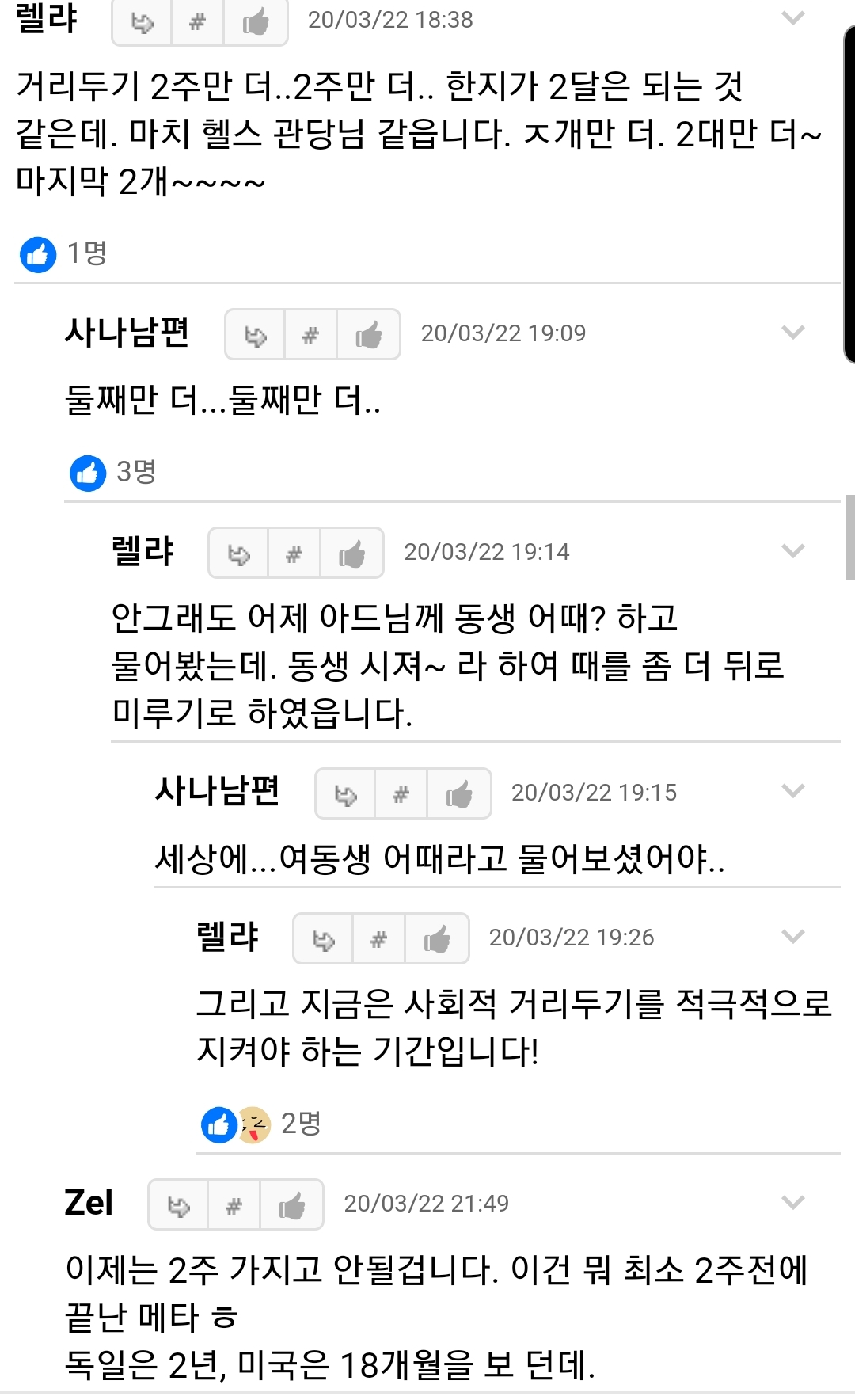 거리두기 2주만 더..2주만 더.. 한지가 2달은 되는 것 같은데. 마치 헬스 관장님 같네요(by 렐랴님). 2주 동안 꾹 참았는데, 또 2주 연장...