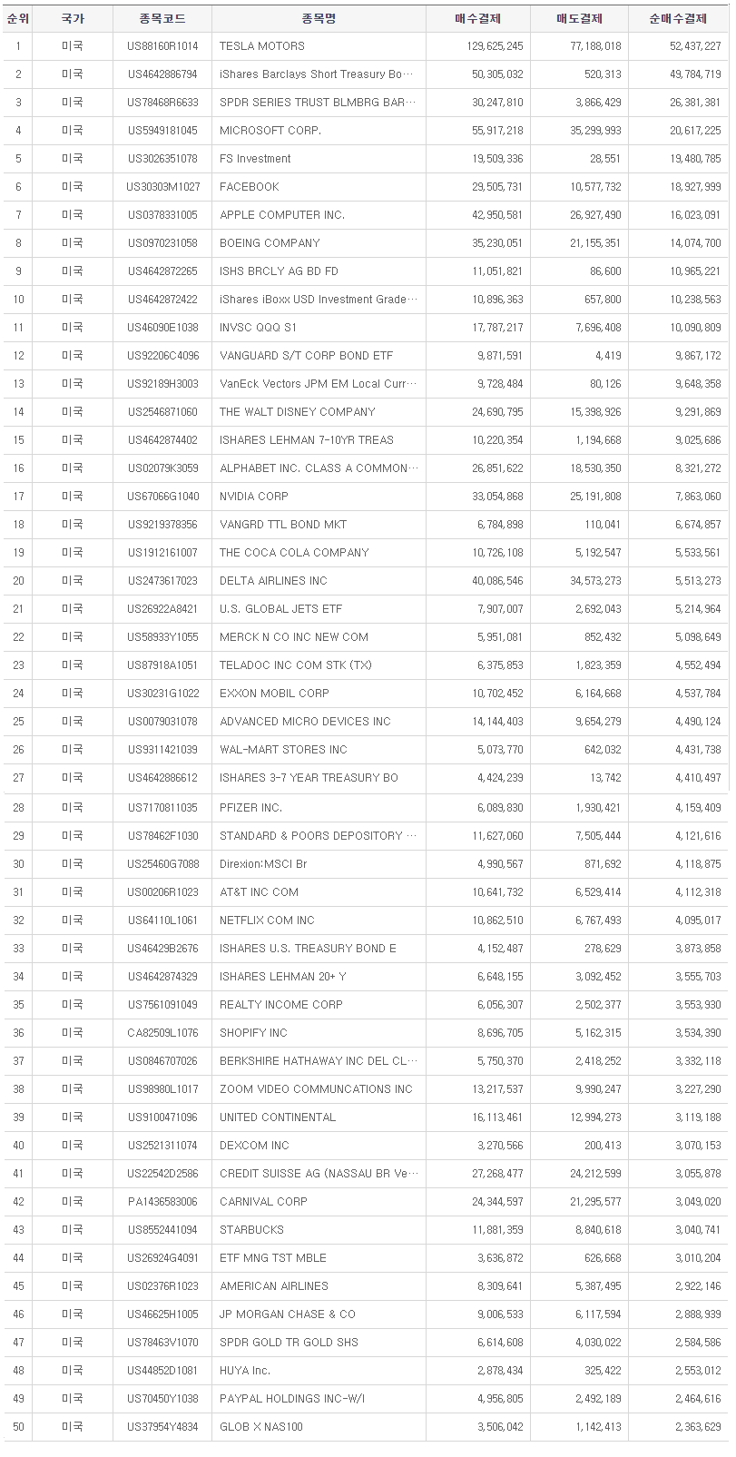 지난주 미장의 특징은 그야말로 불빠따의 항공주, 드디어 터지기 시작한 정유주, 전고점 돌파를 향해 달려가는 나스닥 등 그야말로 정신나간 한 주였습니다. 그래서 주식 매수 패턴도 상당히 바뀌었는데, 한번 표를 통해서 어떤 트렌드 변화가 있는지를 볼까 합니다. 다들 아는 회사는 넘기겠습니다. 여전히 1위는 테슬라입니다. 보관규모로는 구글을 제치고 4위로 뛰어올랐습니다. 한국인들도 테슬라 사랑이 여전합니다. 그런데 2,3위가 특이합니다. 각각 SHV, BIL라는 채권 ETF입니다. SHV는 단기채 중에서도 1년 미만의 만기의 채권이고, BIL은 T-BILL이라고 해서 1~3개월짜리 초단기 채권입니다. T-Bill의 경우 포트폴리오에서는 거의 현금취급하는 물건이죠. 많은 사람들(혹은 기관들)이 현재의 상황을 보수적으로 바라봐야 한다는 생각이 강한가 봅니다. 5위는 저도 처음 들어본 회사입니다. 어디 국내 헤지펀드에서 투자하나? 8위 보잉, 축하드립니다. 한 주 사이에 엄청난 상승이 있었지요. 10위, 지난 글에서 설명드렸던 투자등급 회사채 ETF인 LGD입니다. 11위, VCSH라고 해서 Vanguard 사의 단기 회사채 ETF라고 합니다. 1~5년 사이 만기의 투자등급 회사채를 산다고 합니다. 저도 처음 봤네요. 12위, EMLC라는 ETF입니다. 올 웨더 포트폴리오 공부하시는 분들은 한번쯤 들어보셨을 겁니다. 국채 중에서도 이머징 국가의 채권을 구입하는 것입니다. 브라질, 인도네시아, 멕시코, 태국, 남아공 등 이머징 국가에 해당되는 여러 나라의 국채를 사들입니다. 코로나로 인해 전세계적으로 어느 나라, 어느 경제권이 더 많은 타격을 입었는지는 알 수 없기 때문에 분산 투자를 하려는 사람들이 찾는 거죠. 초저금리 시대에 높은 이자를 주는 이머징 국가 채권은 상당히 매력적이기도 합니다. 다만 환율을 고려해야겠지요. 15위는 7~10년 만기 미국 국채에 투자하는 IEF입니다. 이정도면 중기 채권으로 분류됩니다. 전통적인 60/40 포트폴리오에서는 이 친구를 TLT 대신 사용하기도 합니다. 만기가 적당하기 때문에 상당히 안정적이죠. 21위. JETS라고 해서 항공사들에 투자하는 ETF입니다. 최근 항공사 주가들이 날아오르고 있기 때문에, 한 달정도 단기 수요는 있지 싶습니다. 코로나 전고점까지는 못 올라가더라두요. 22위. Merck라는 제약회사입니다. 시총 꽤나 큰 우량주이기도 합니다. 그러나 이런 회사가 22위까지 올라온 이유는, 무엇보다도 백악관의 'Operation Warp Speed' 프로그램이라 해서 프로그램 당 3만명의 임상 대상자를 지원해서 코로나 백신 3상을 초고속으로 진행하겠다는 것이 있습니다. 제조는 미리 해둬서 3상 결과 나와서 의미가 있으면 그자리에서 접종을 시킬 수 있게 하는 쇼미더머니급 돈지랄 프로그램입니다. 여기에 5개 업체가 선정되었는데 Merck가 모두의 예상을 깨고 선정되었습니다. 그래서 사볼 만하죠. 23위. Teladoc은 제가 탐라에서 가끔 이야기하는, 원격의료 업체입니다. 최근 언택트 붐이 끝나면서 주가가 20% 가까이 빠졌는데, 저가매수를 노리고 들어온 매물로 보입니다. 분명 아직 원격의료는 미국에서 활발하게 이루어지고 있으니까요. 28위. 화이자도 Operation Warp Speed의 일원입니다. 주중에 유방암 치료제 관련 연구 하나를 3상에서 날려먹어서 주가가 좍 빠지기도 했었죠. 29위는 SPY입니다. 언제나 옳습니다. 30위...이야 진짜 세상에 고수가 널린 걸 이렇게 느낍니다. BRZU라고 해서 MSCI Brazil Market Index를 2배 레버리지로 추종하는 ETF입니다. 세상에 이걸 벌써부터 이렇게 많이 샀다니... 돈 많이 버셨을 겁니다. 저는 오늘에나 중남미 주식시장도 회복중인 거 알았는데.. 33위는 GOVT라고 해서 미 재무부 채권을 1~30년 만기 모두 일정 비율로 사들이는 ETF라고 합니다. 34위는 TLT로, 20년 이상의 만기 국채를 사들입니다. 미 재무부 채권 ETF 중에서는 만기가 가장 깁니다. 채권 ETF중에서는 수익률이 높은 편이지만, 의외로 변동성이 높습니다. 35위는 Realty Income이라고 해서 국내에서 유명한 리츠업체입니다. 흔히 이야기하는 고배당주 이야기할 때 무조건 들어가는 회사입니다. 티커가 특이하게도 O입니다 ㅋㅋ 상업용 리츠로 유명한데, 저는 거들떠도 안 보는 주식입니다. 언젠가 배당주 이야기를 할 텐데, 저는 배당주 투자를 상당히 나쁘게 봅니다. 게다가 상업용 리츠. 미래가 없는 회사로 봅니다. 36위 쇼피파이. 너무 올라서 한창 조정받고 있지만, 여전히 매력적인 회사죠. 국내에서 동대문 의류소매상들조차 해외에 물건팔때 쓰는 플랫폼이 쇼피파이입니다. 40위 Dexcom. 당뇨병 관련 의료기기 회사로 굉장히 뜨고 있는 회사 중 하나입니다. 역시 최근 주가가 많이 빠져서(조정으로 보입니다. 펀더멘탈 나쁘지 않아요) 그걸 캐치하고 들어온 듯합니다. 41위. TVIX입니다. 대체로 숏의 일종인데, 음...지금도 이거 들고 계시다면 어서 손절하고 주식하지 마세요. 진심입니다. 술담배는 해도 TVIX는 타는 거 아닙니다. 3배 인버스 레버리지보다도 지독한게 티빅스입니다. 44위. IPAY라고 해서 핀테크 관련 기업에 투자하는 ETF입니다. 저는 클라우드와 핀테크 중 하나를 고르라면 전자를 고르는데, 사람들 생각은 다 다르겠지요. 핀테크 기업이 퍼포먼스가 향후