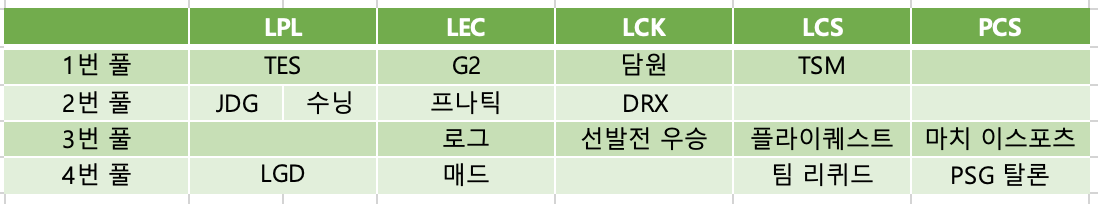 -> 4번 풀의 경우 '이변이 없을 경우 기준이며, 아래 마이너 지역 팀들이 플레이인에서 이변을 만들면 합류할 수 있습니다'
