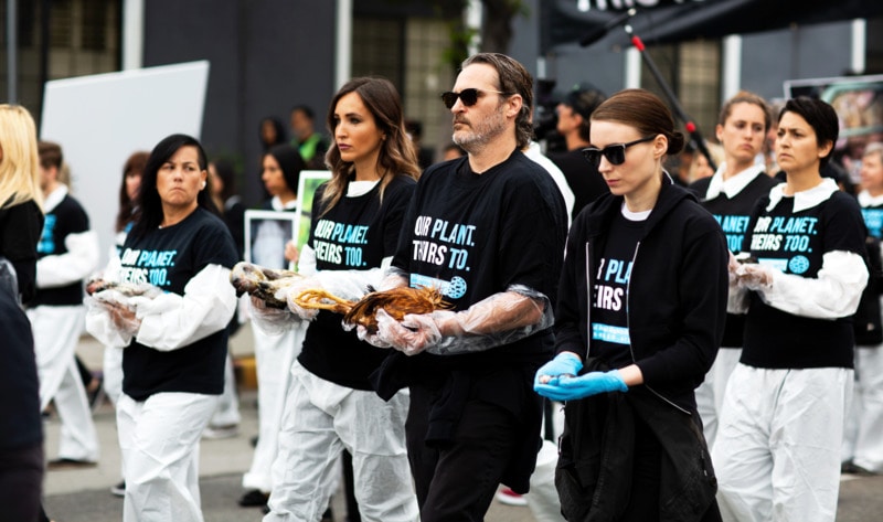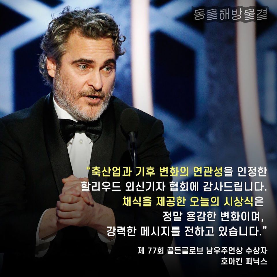 <지탄다가 아니라 치탄다라구욧! 하와와> ![]() 호아킨은 히피 부모에게서 나고 자랐으며 요절한 유명 배우 리버 피닉스의 동생이기도 합니다. 와킨이 3살이던 때 물고기가 잔인하게 죽는 장면을 보고 다섯 형제들이 다같이 비건이 되기로 했다는군요. 현재 파트너인 배우 루니 마라도 비건이고 최근 둘 사이에 아들이 생겼습니다. <왜 비건이 되었나요? 인터뷰> "저한테는 그냥 너무 분명해요. 저는 감정을 느끼는 다른 생명체에게 고통을 주고 싶지 않아요." "그걸 목격하고 어떻게 영향을 안 받을 수 있는지 이해가 안 가요." “환경에도 파괴적인 영향을 미치고요.” ![]() 호아킨은 In Defense of Animals, PETA와 같은 각종 동물권단체 뿐 아니라 각종 인권단체, 환경단체에 꾸준히 후원 및 직접적인 활동을 해오고 있습니다. 2019년 PETA 올해의 인물에 선정되기도 했지요. 2005년에는 그 유명한 다큐멘터리 ‘Earthlings(지구생명체)’의 나레이션을 맡게 됩니다. ![]() 지구생명체는 단일 영상으로 가장 많은 사람을 채식주의자로 만든 영상물이라는 말이 있을 정도로 사람들에게 큰 영향을 끼쳤습니다. 이후 ‘What the health(몸을 죽이는 자본의 밥상)’의 제작을 지원하였고, 2018년에는 지구생명체 최신판이라 불리는 다큐멘터리 Dominion(도미니언)에서 루니 마라, 시아 등과 함께 다시 나레이터로서 참여합니다. (위 세 영상들은 모두 유튜브에서 무료로 감상하실 수 있습니다. 한글자막도 있어요.) ![]() 재미있는 에피소드가 하나 있습니다. 양복 제작에는 양털이 들어간다고 하는데요. 와킨은 그 사실을 몰랐다고 합니다. 뒤늦게 그 사실을 알게 된 호아킨은 바로 양복 없는 수트 캠페인을 진행했습니다. 40년 넘게 비건으로 살아온 그도 완벽하지 않았다는 점, 그리고 알게 된 즉시 실천으로 옮겼다는 사실이 초보 비건인 저에게 괜스레 힘이 되었습니다. 작년 골든글로브 시상식에는 작은 이변이 있었습니다. 그 이변이란 와킨이 조커로 남우주연상을 수상한 건 당연히 아니었고요. 바로 비건 채식 메뉴로 식사가 제공된 것이었습니다. 호아킨은 수상소감에서 골든글로브의 선택을 칭찬하고, 호주 산불 문제에 대해 단순한 응원 이상의 행동이 필요하다고 말하는 등 사회문제에 대한 자신의 생각을 거침없이 말하여 화제를 불러 일으켰습니다. ![]() 그래서였을까요? 골든글로브에서의 와킨의 연설과 비건 메뉴가 예상 외의 주목을 받자 곧이어 진행된 미국배우조합상 시상식, 아카데미 시상식에서도 예정에 없던 비건 채식 메뉴로 식사가 제공되게 됩니다. 올해도 위 3개 시상식에서 채식으로 식사가 제공이 될지 개인적으로 귀추가 주목됩니다. "영화가 저와 여기 계신 많은 분들께 선사한 가장 위대한 선물은 목소리를 낼 수 없는 약자를 위해 우리가 소리를 낼 수 있는 기회라고 생각합니다." 호아킨은 위의 골든글로브 남우주연상 수상 후 환경운동 시위에 참여하여 체포당했고 ![]() 미국배우조합상 시상식에서는 남우주연상 수상 후 행사 도중 빠져나와 정장 차림으로 비질(vigil)에 참여하였습니다.