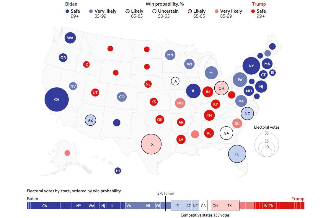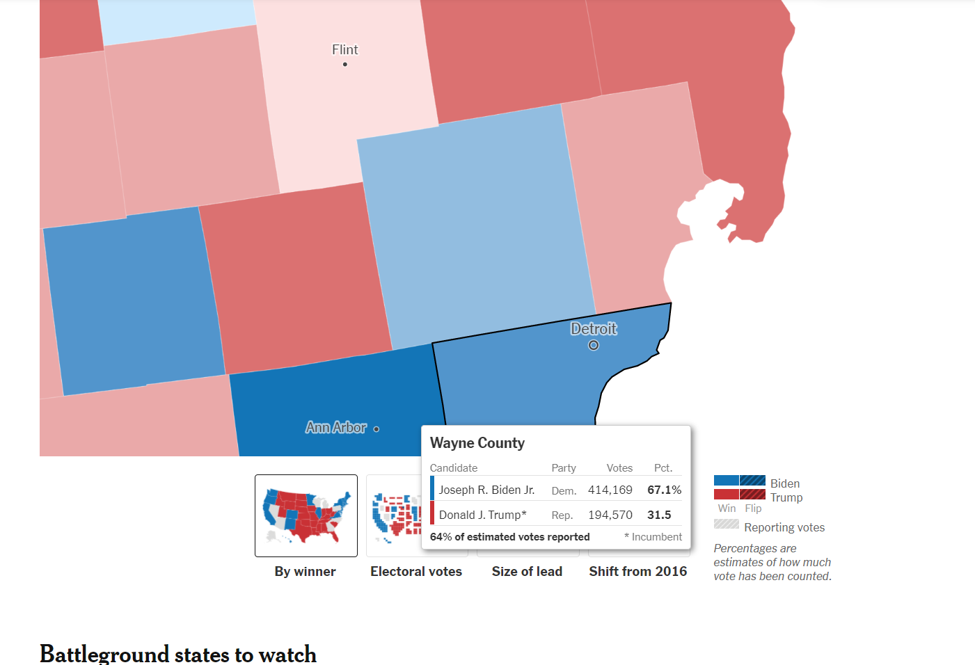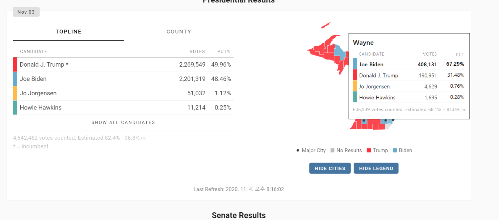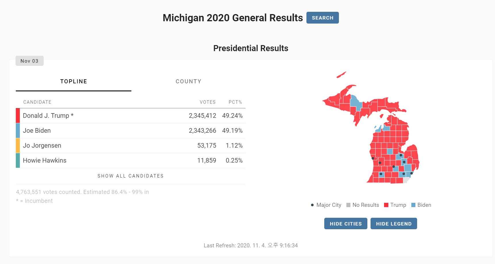 위스콘신, 조지아, 미시건 정도 주의 깊게 봐야겠네요. 수업에선 조지아를 레드 스테이트라고 배웠던 거 같은데, 이번 선거 양상은 엄청 흥미롭네요.