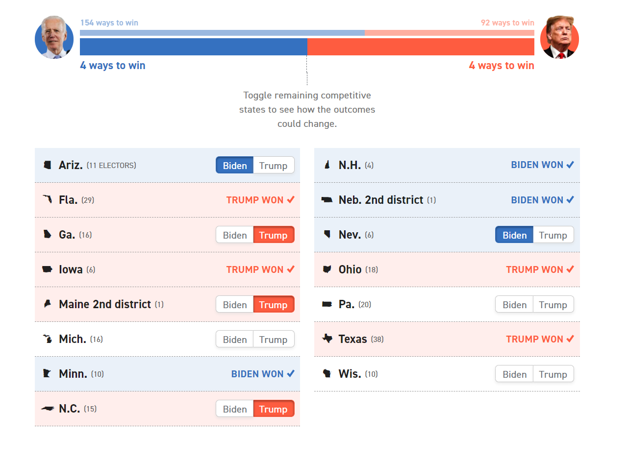 전체적으로 보면 여론조사가 틀리진 않았는데 조지아가 트럼프라고 나온다면, 트럼프의 승리시나리오가 바이든하고 6:4 정도로 길항한게 되어서 부정확성에 대해서는 어느정도 지적이 있긴 할꺼같아요. 플로리다,NC,조지아 중 두 개만 가져오고 선거 조기종료 시키는 게 여론조사에서 가장 많이 예측된 시나리오였는데 빗나가버린거니