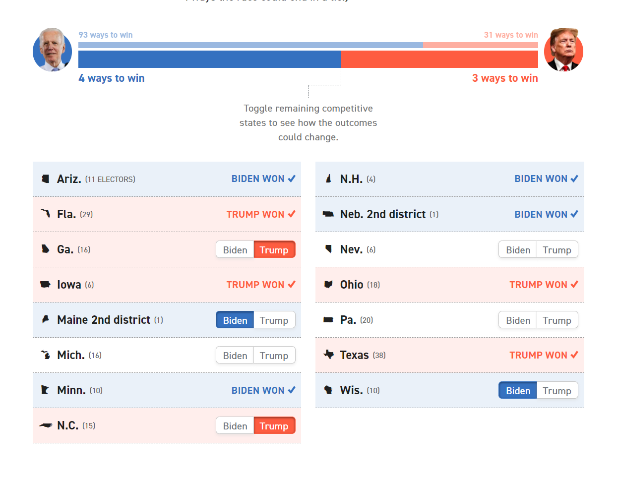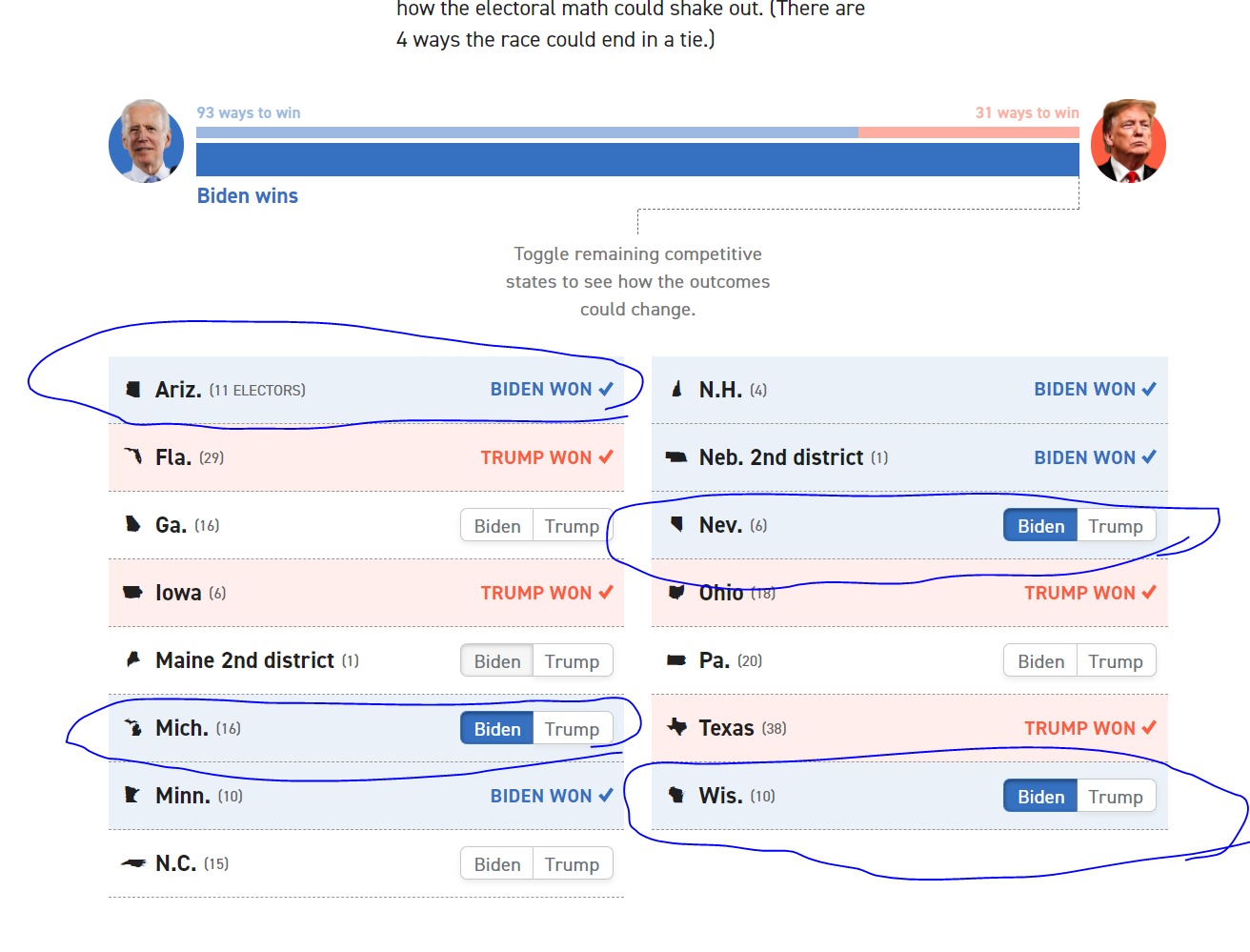 이러면 바이든이 여전히 이기겠지만, 트럼프가 문제삼은 위스콘신(10), 미시간(16), 펜실베이니아(19) 중 하나만이라도 트럼프의 억지로 뒤집어질 경우 트럼프가 ... 더 보기