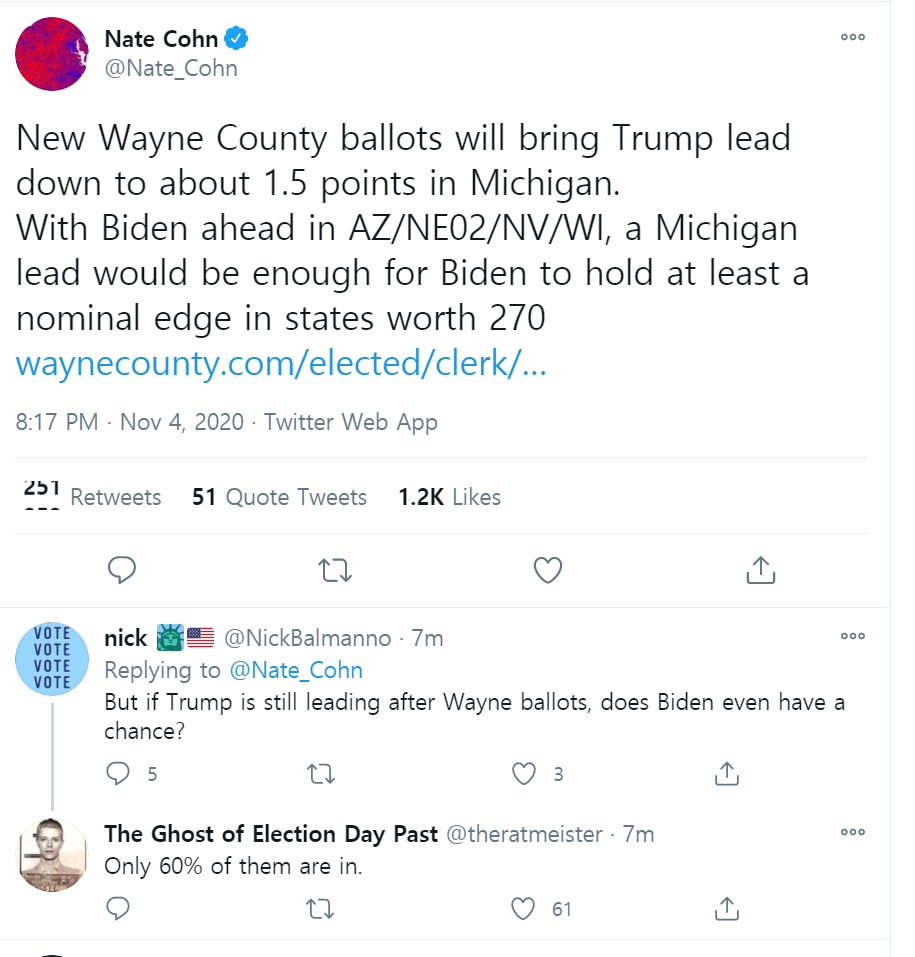 아직 한참 섣부르지만 만약 이대로 미시건까지 전복되어서 미시건-조지아-펜실베이니아 죄다 까 보니 르브론이더라는 결론이 나온다면 사전 예측이 아주 엉망으로 틀린 정도까진 아니긴 합니다. 플로리다 정도만 명확히 빗나간 거고 나머지는 어느 정도 오차 범위 안이니까요. 텍사스도 따는 거 아니냐 하는 설레발이 좀 우스워졌을 뿐.. 이런 가정 하에서는 실상은 꽤 격차가 있었으나 우편투표 개표를 뒤늦게 하면서 전개상 접전이 된 격이 됩니다. 만약 우편투표부터 개표했으면 랜드슬라이드 아니냐는 설레발 나왔겠죠.