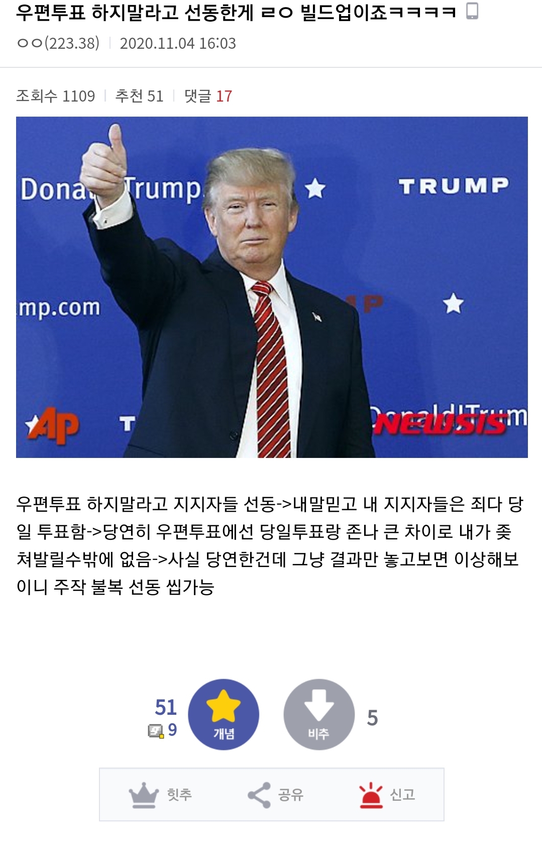 불 지피네요. 벌써 사기(Fraud)라고 하고, 연방대법원으로 간다고 하는데, 지는 것으로 나오면 폭동이라도 대놓고 부추길 듯(직접적인 표현은 안 쓰더라도). 대법관 수도 맞춰놨고, 우편투표 늦게 오는 것들은 다 집계 안 되게 하는 예정대로의 시나리오로. 민주당 지지자들은 또 반발할 테고. 당분간 혼란은 피할 수 없을 것 같군요.