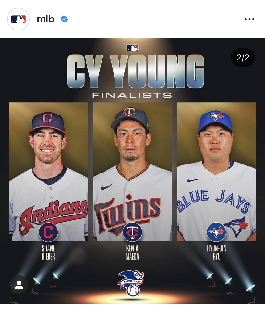안녕하세요 김치찌개입니다! 류현진이 2019시즌에 이어 올시즌에도 싸이영상 최종후보 3인에 올랐네요 정말 대단합니다 최종후보 3인은 왼쪽부터 셰인 비버(클리블랜드),마에다 켄타(미네소타),류현진(토론토)입니다 셰인 비버가 제일 유력하죠 마에다도 올랐군요 팀 잘 옮긴거 같습니다 류현진은 올시즌 12경기 선발 출전해서 5승 2패 72K 평균자책점 2.69를 기록했습니다 무엇보다 대체선수대비 승리기여도 즉 WAR이 리그 2위였죠 0